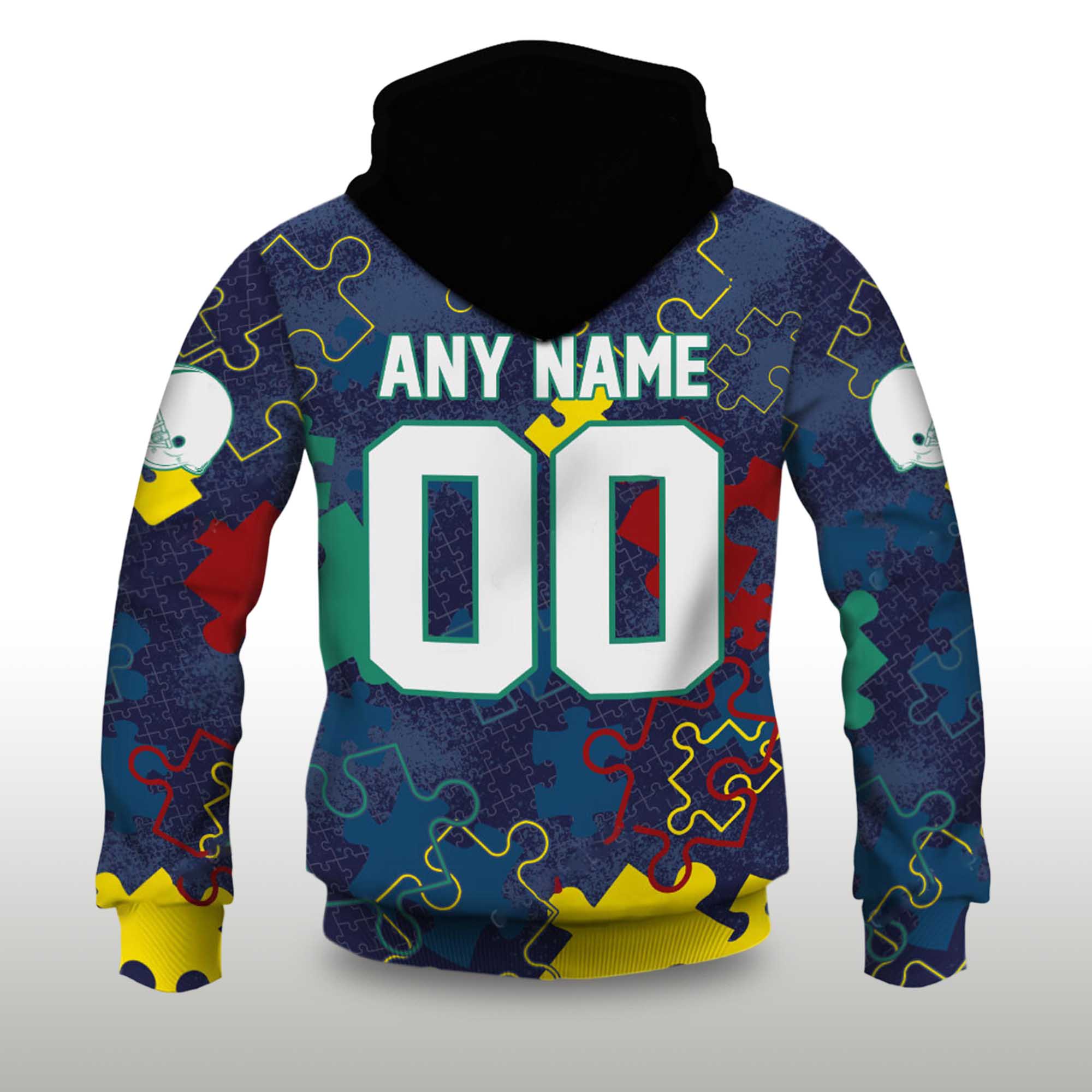 This hoodie features a vibrant, all-over patchwork design, a symbol associated with autism awareness. At the center, a soccer helmet image highlights the design within the team’s culture. The dark blue background accentuates the colorful patchwork, creating a striking look suitable for game days, casual wear, or community events.