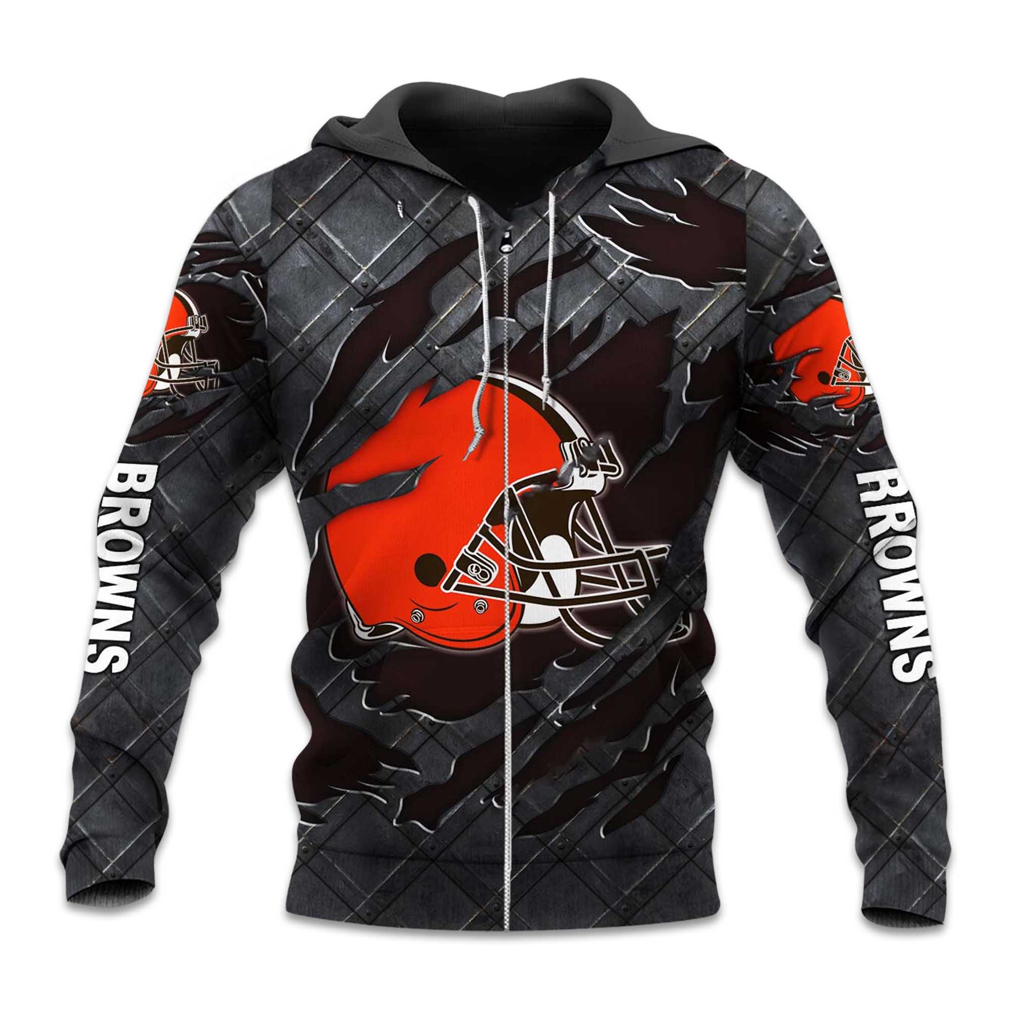 The Browns Black Metal Texture Zipper Hoodie stands out with its cracked metallic print, adding depth and personality. The helmet image on the front provides instant team identification, while the soft inner lining keeps you warm and comfortable. The fabric is soft against the skin and suitable for cool or mild weather. This hoodie is perfect for fans who want their team’s attire to look modern and confident.