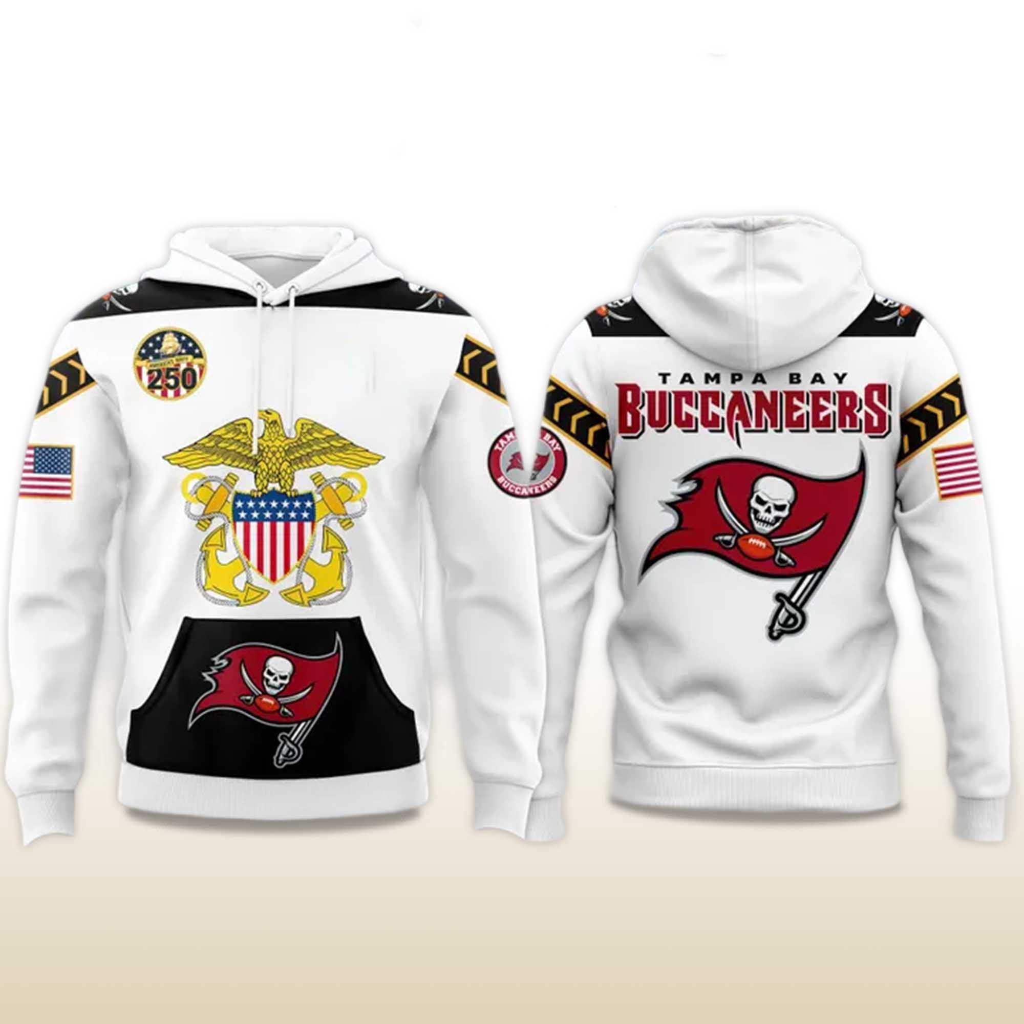 The hoodie features a crisp white base and striking red, black, and gold accents. Up front, a golden eagle with the American shield immediately grabs attention, while flag patches on both sleeves add a patriotic feel. The Buccaneers logo is prominently placed on both sides, along with a commemorative patch marking the 250th anniversary. The hood and drawstring add a sporty touch, and the warm fleece keeps you comfortable on chilly evenings.