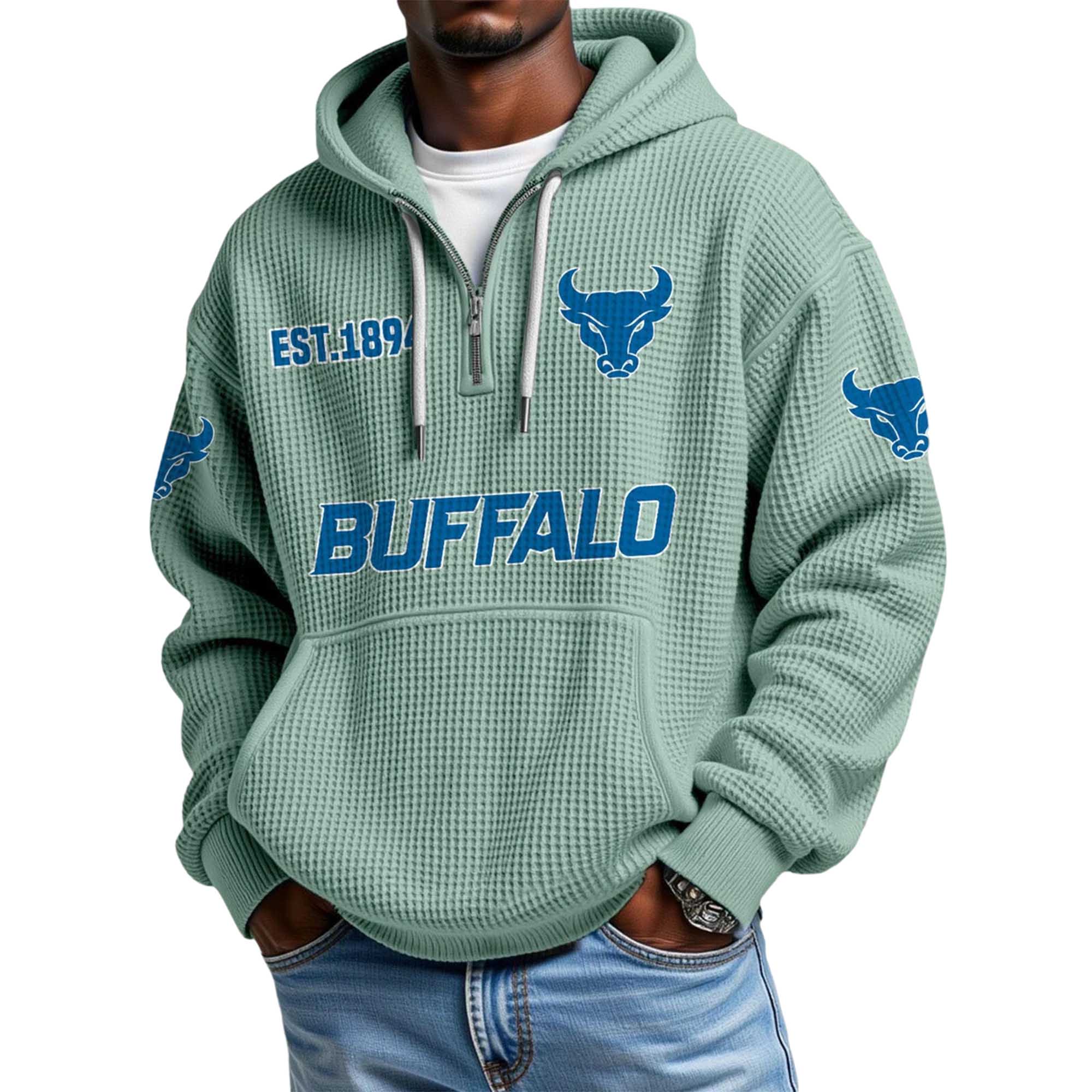 The Buffalo EST 1894 Quarter Zip Waffle Hoodie reflects a strong college identity through the bold “BUFFALO” lettering, the iconic bull logo, and historical EST.1894 details. Designed for those who value tradition and modern comfort, this hoodie offers a confident look, perfectly suited for everyday, street, and student styles.
