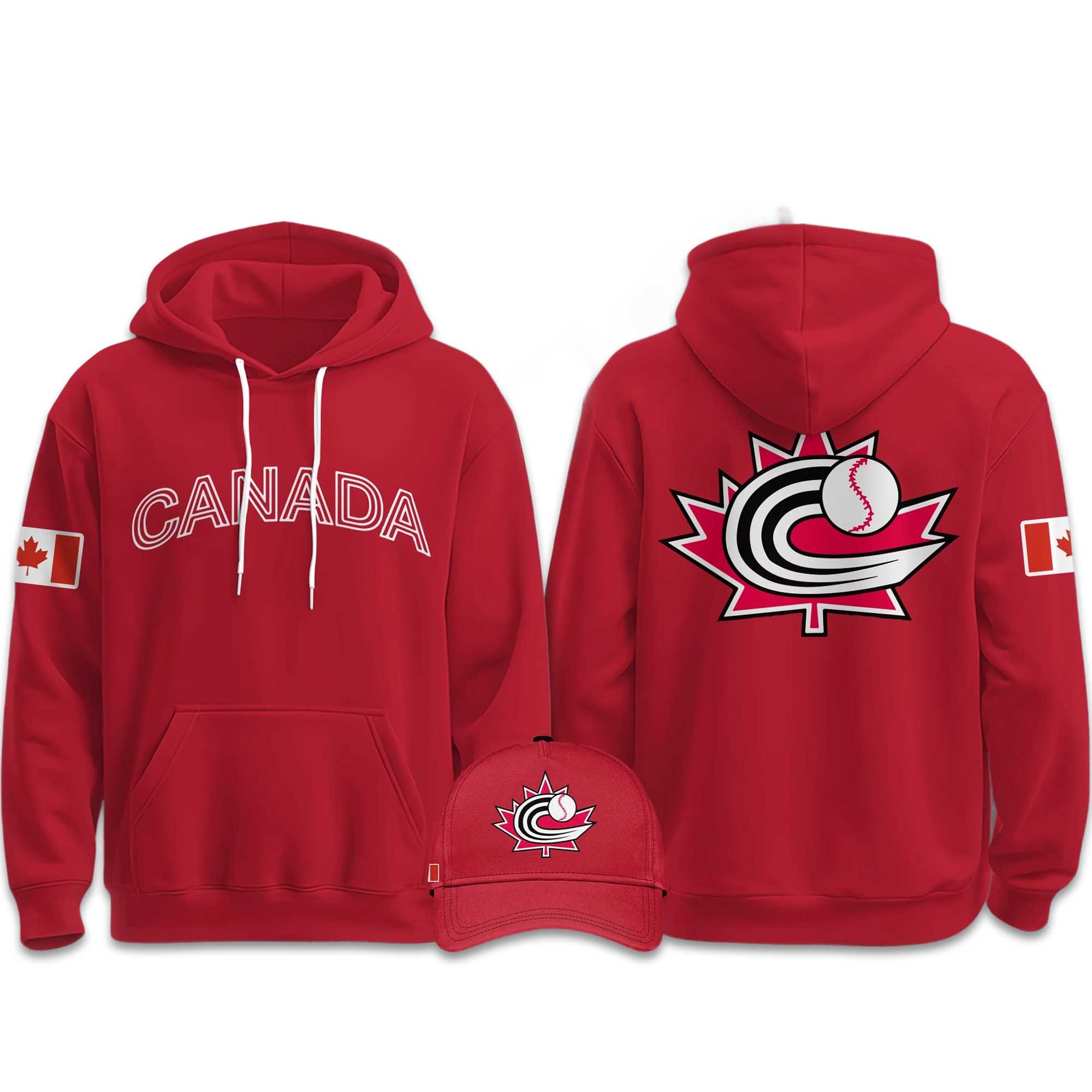 The Canada Baseball 2026 World Baseball Classic Hoodie offers a professional, sophisticated look with Canada’s signature red and white colors. The front features bold red lettering of “CANADA,” complemented by matching red trim along the button placket and collar. The Canadian flag is printed on both sleeves, showcasing patriotism. The back allows for custom name and number printing in bold red lettering. Made from lightweight, breathable fabric, this jersey provides comfort, durability, and a classic baseball style, ideal for game days or everyday wear.