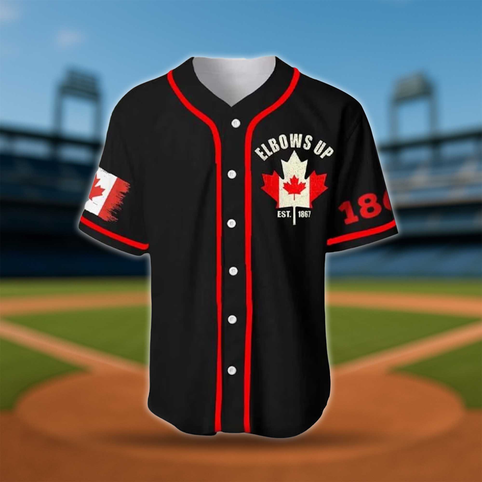The Elbows Up Est 1867 Canada Baseball Jersey features a sleek black base accented with vibrant red trim along the front and button-down sleeves. The front features bold white “ELBOWS UP” surrounded by a Canadian maple leaf, while “EST. 1867” honors the country’s founding. The back and sleeves proudly display the maple leaf flag for a patriotic touch. With a classic baseball silhouette and vibrant color scheme, this design turns any outfit into a celebration of Canadian spirit and endurance.