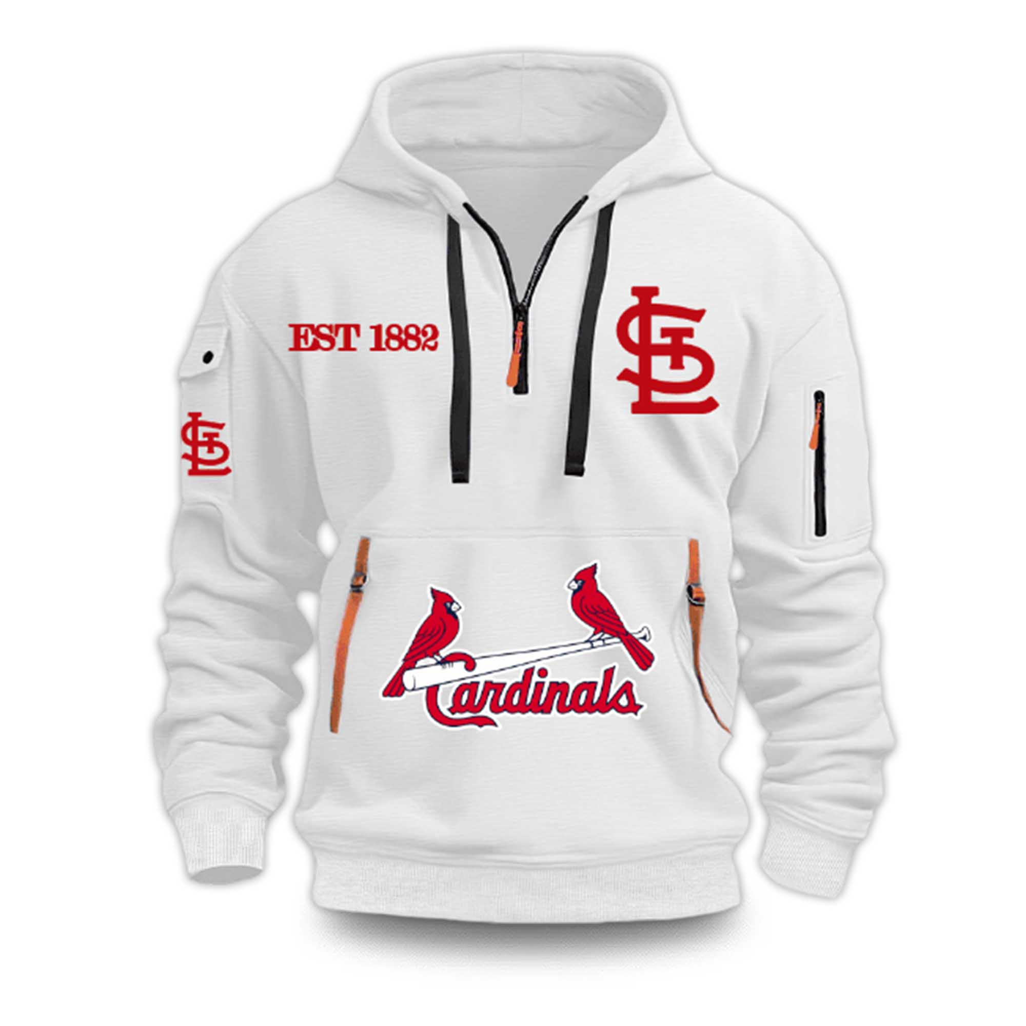 This hoodie features a pristine white base with striking red graphics inspired by the Cardinals, creating a clean and dynamic look. The front incorporates EST 1882 detailing the team’s history, while the bold chest logo evokes classic baseball style. The large kangaroo-style pocket displays the Cardinals logo with the iconic bird image, creating a strong focal point. Orange zipper details provide a modern contrast, making the design fresh, sporty, and different from typical fan apparel.