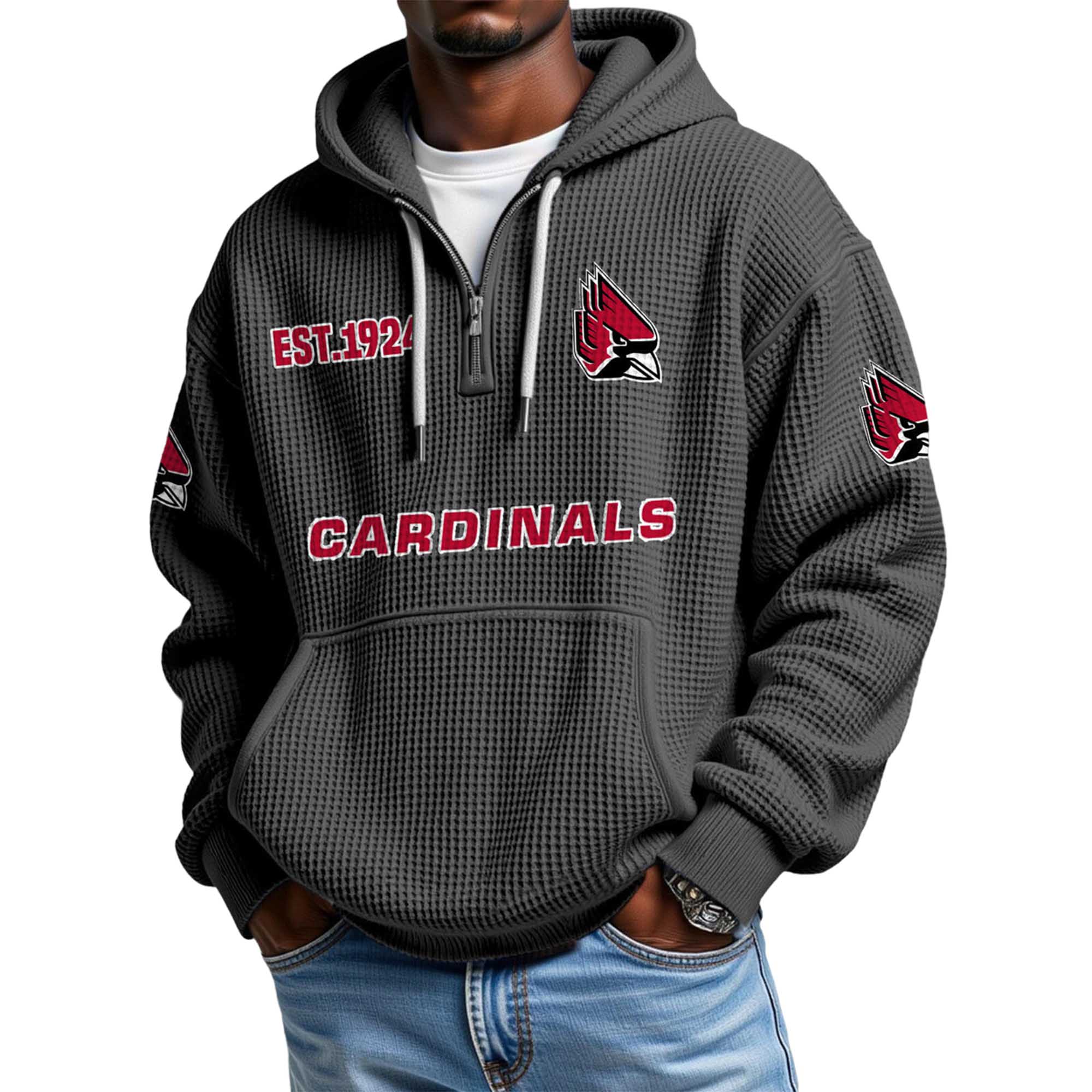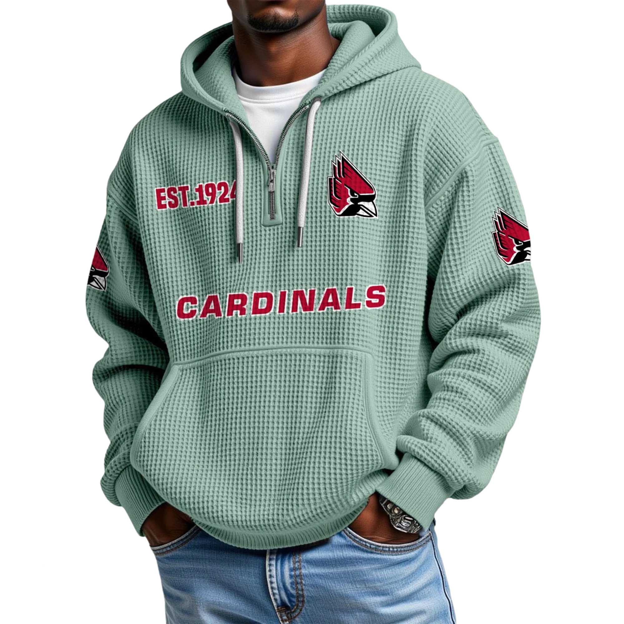 The Cardinals EST 1924 Quarter Zip Waffle Hoodie brings a strong college-style presence, inspired by the team’s heritage and pride. Featuring the prominent “CARDINALS” lettering, EST.1924 detail, and the iconic cardinal bird head, this hoodie embodies tradition while offering a modern look suitable for everyday wear and street style.