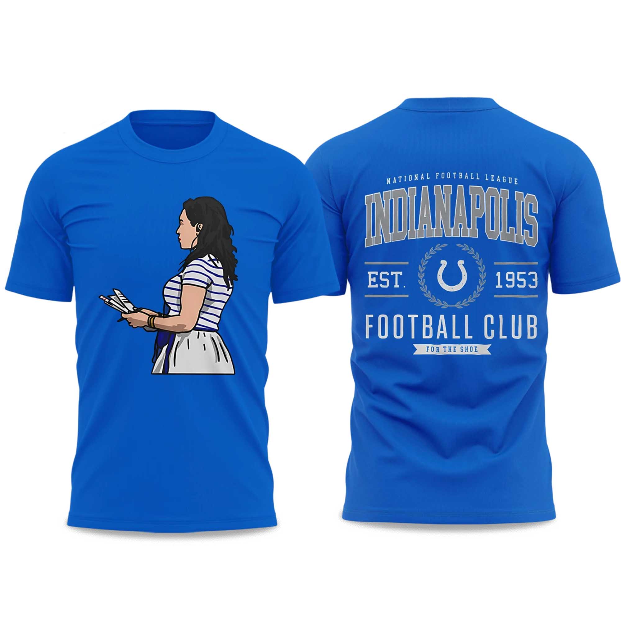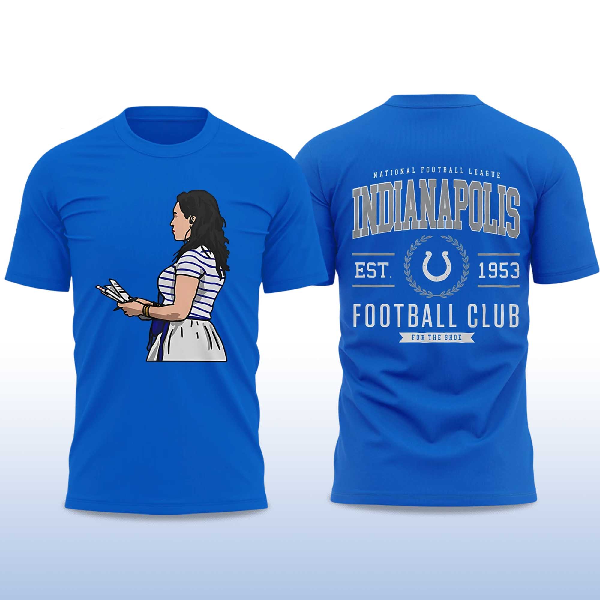 The shirt features a crisp royal blue base and a subtle white graphic. The front features a side illustration for an artistic touch, while the back proudly displays “INDIANAPOLIS FOOTBALL CLUB EST. 1953” and the official horseshoe logo. The soft cotton fabric keeps you cool and comfortable whether you’re at stadium or watching football at home. Durable stitching and a fade-resistant print ensure lasting quality through all seasons.