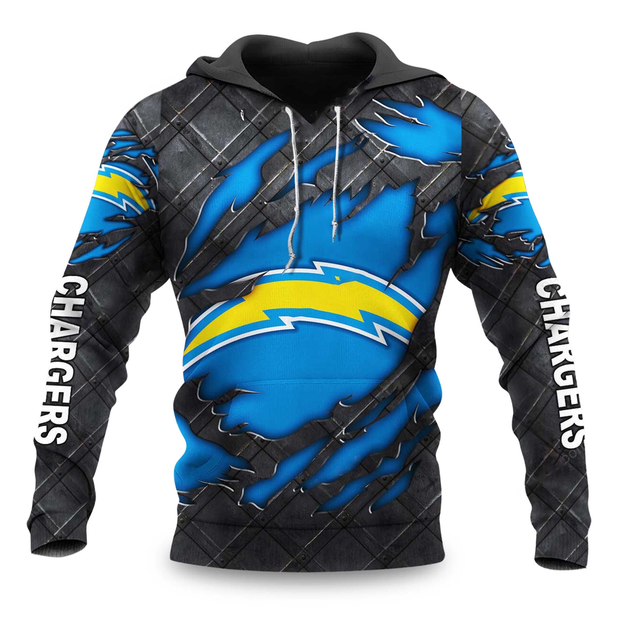 The Chargers Black Metal Texture Hoodie is becoming increasingly popular as apparel continues to move towards lifestyle fashion. Los Angeles Chargers fans are opting for hoodies that can be worn outside of game days, and this design reflects that shift. The black metallic pattern combined with the lightning bolt logo fits current streetwear trends while maintaining pride in the team.
