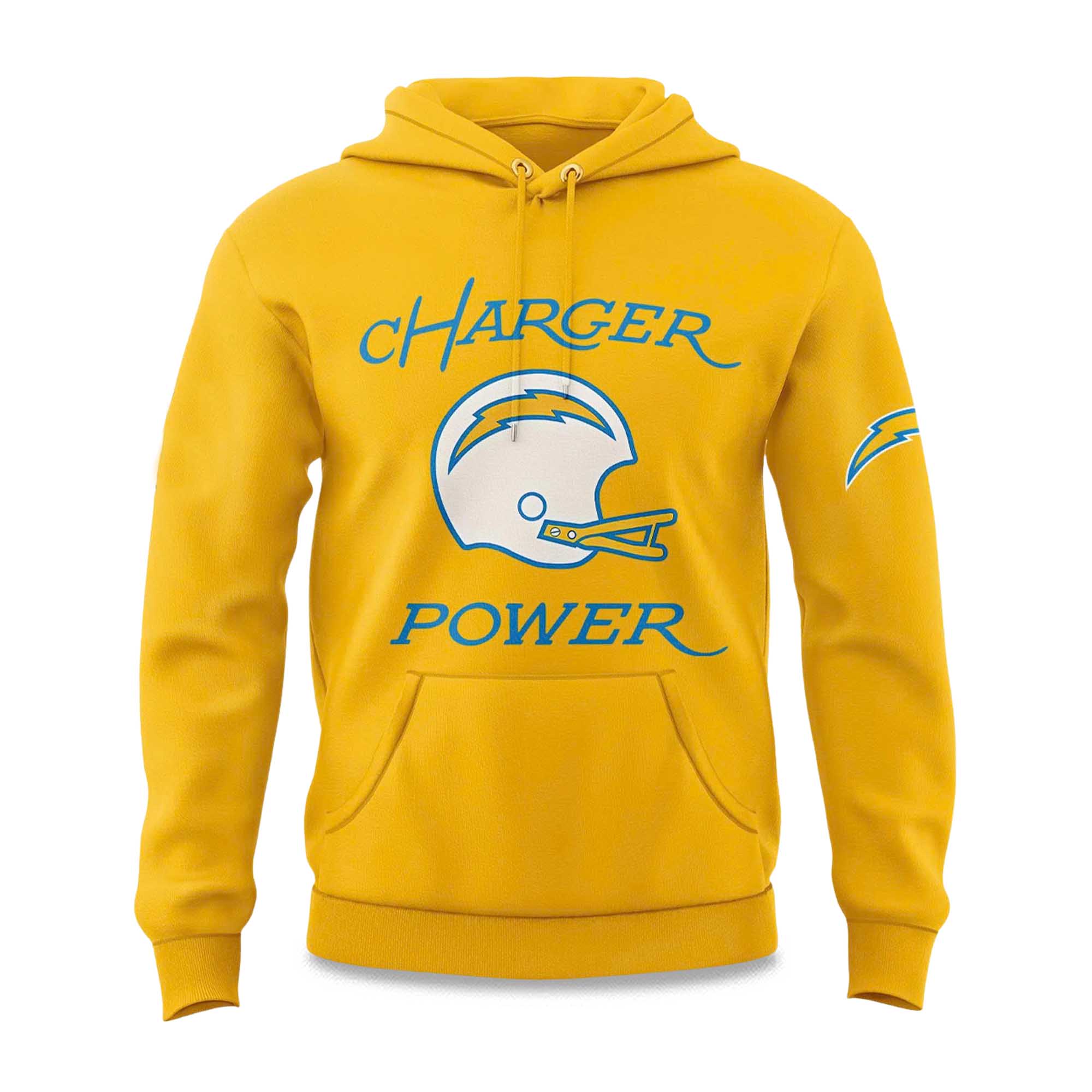 The hoodie features a bold yellow base that reflects the Chargers’ dynamic color palette. A bold Chargers helmet graphic is featured at the center of the front with “Charger Power” in signature blue font, creating a clean yet powerful design that stands out everywhere. A logo on the sleeve completes the authentic look. Soft on the inside and durable on the outside, this hoodie offers comfort for all your fun and party activities. Perfect for layering on chilly game nights or casual wear on days off. Every detail—from the drawstring hood to the kangaroo pocket—is designed to be both functional and stylish.