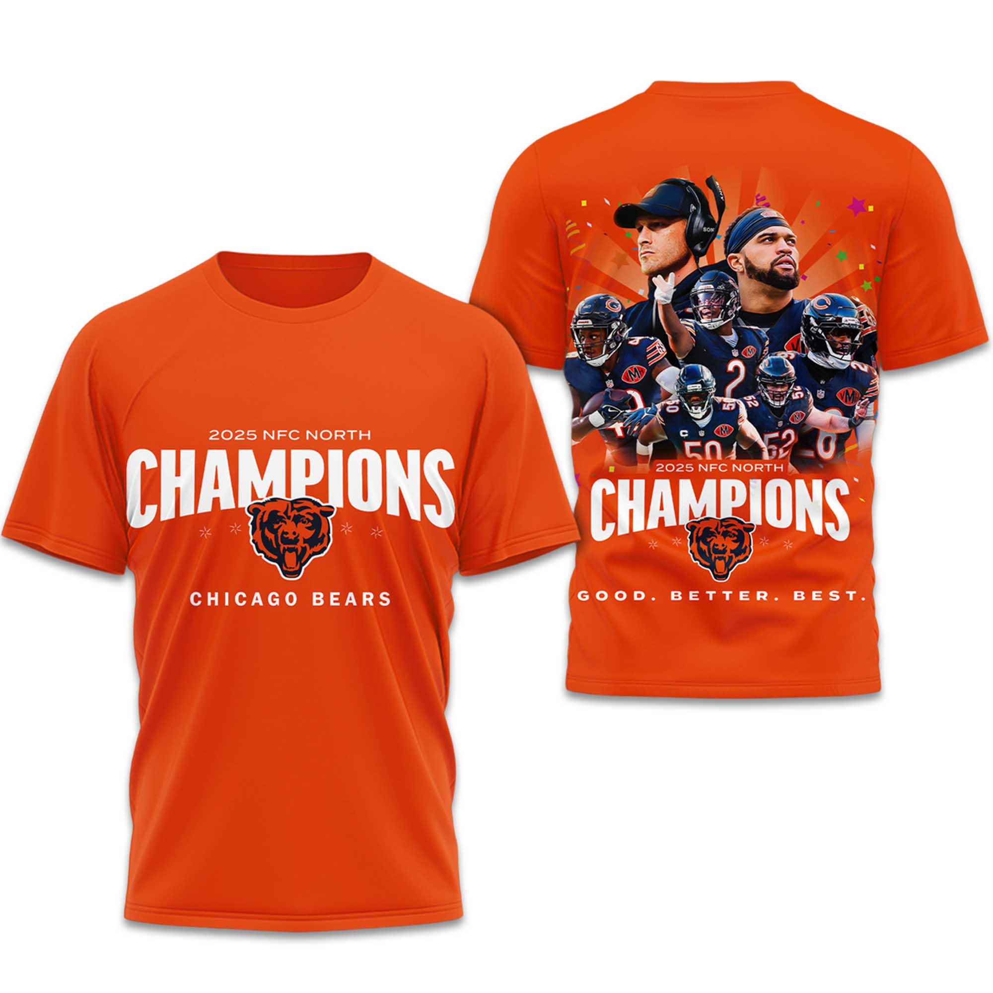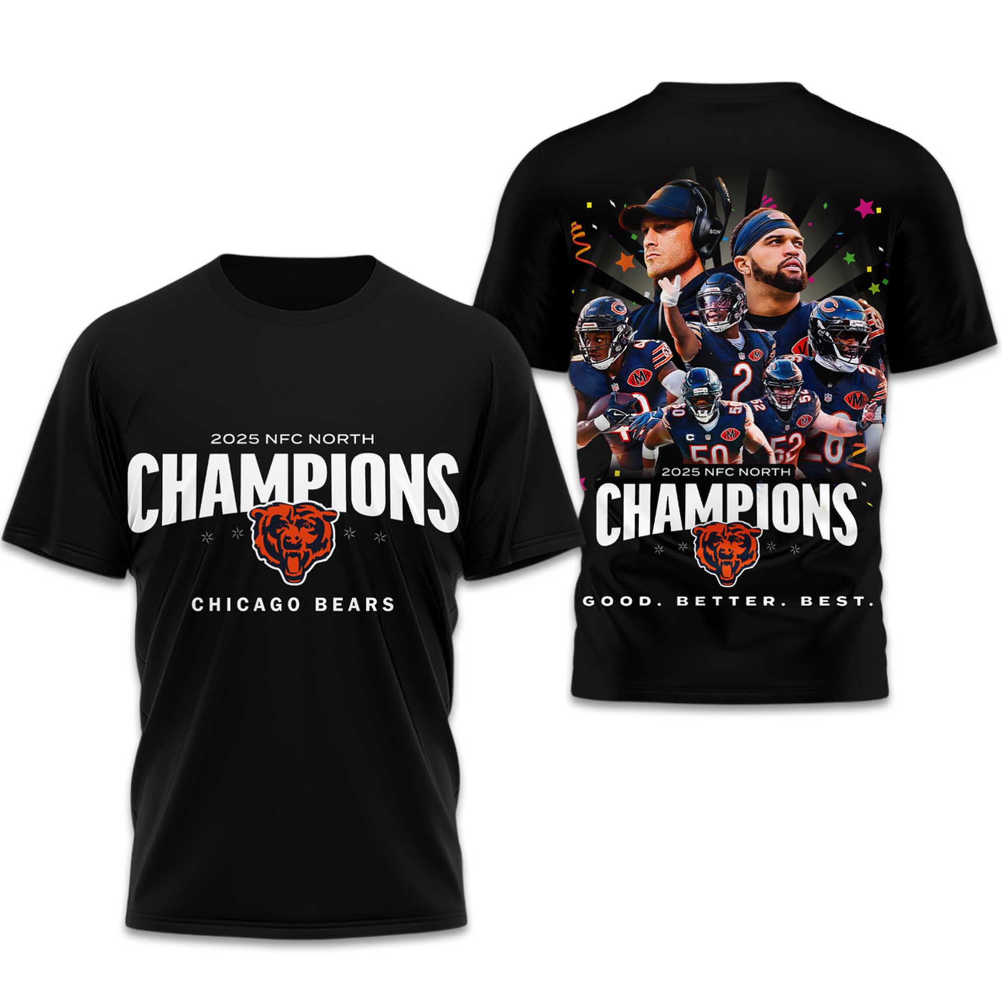The Chicago Bears NFC North Champions 2025 2026 Shirt is designed for fans who want to celebrate this achievement in a bold yet easy-to-wear way. The front proudly displays the championship message, while the back features vibrant imagery inspired by the players, embodying the spirit of the season. This t-shirt is comfortable for everyday wear and holds its shape well, making it a great choice for long-term use and fan collection.