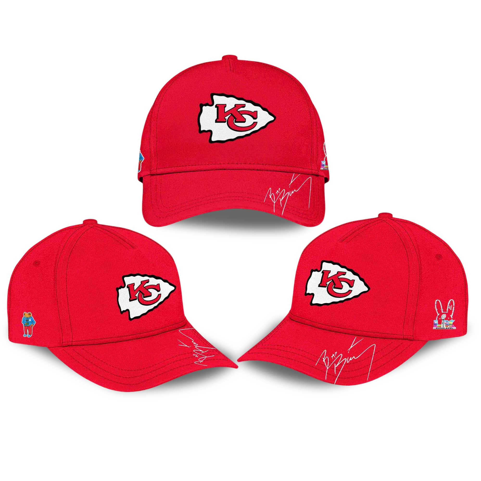 The front proudly shows off the Chiefs arrow logo on a vibrant red background, accented with playful Bad Bunny details like a bunny icon and mini-character patch. His signature is located just below, adding a personal touch. The back features a vibrant Super Bowl LX graphic, surrounded by glowing bunny ears and a city skyline, making this hoodie a living piece of pop culture history.