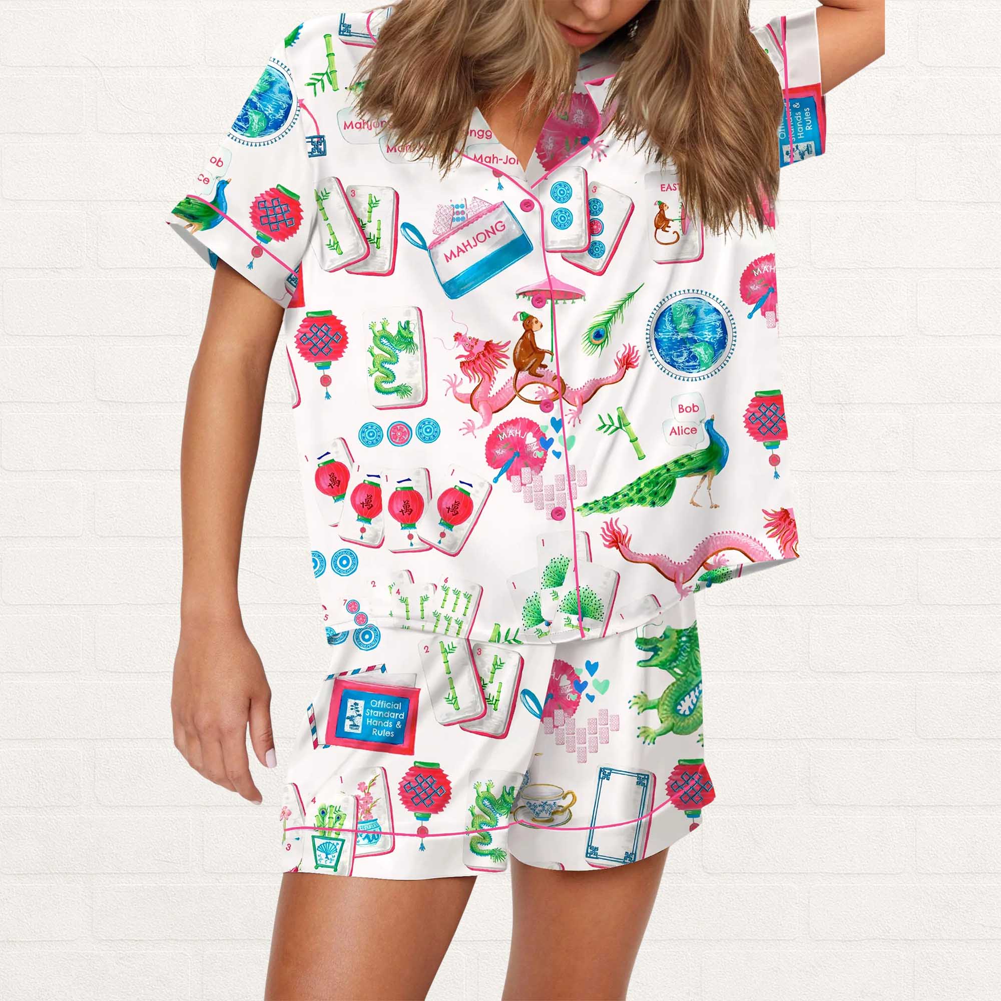 Soft Satin Chinoiserie Mahjong Pajama Set – Cultural Playfulness Combined with Modern Comfort
