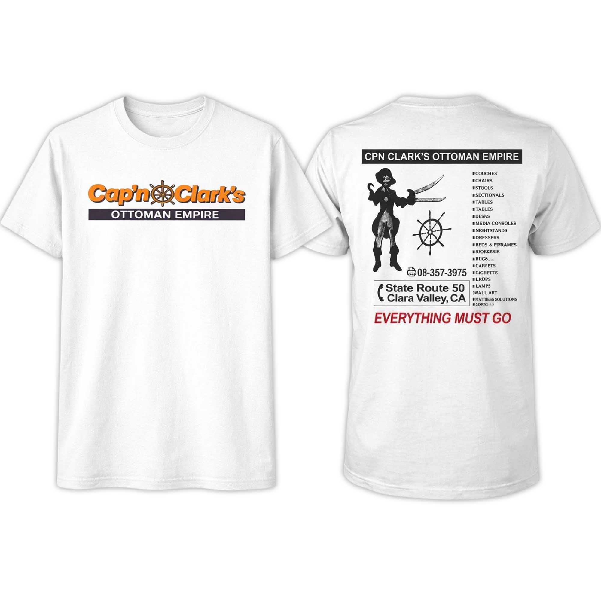 The front of the shirt is simple with the CPN Clark’s Ottoman Empire logo, accented in a bold orange for just the right amount of contrast. The back is where the story unfolds, with a detailed layout featuring illustrations, lettering, and structured graphic elements. The combination of typography and imagery creates a unique, almost classic yet modern and wearable feel.