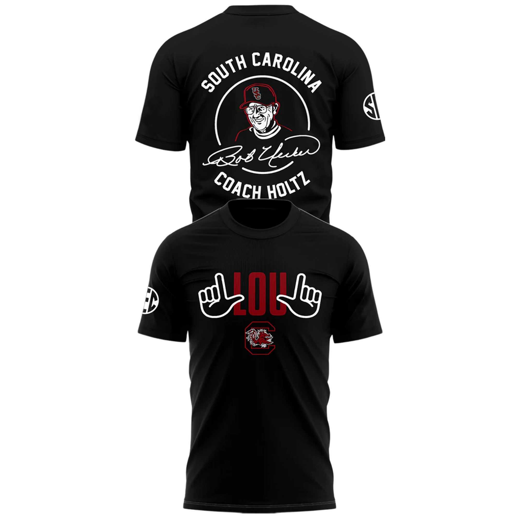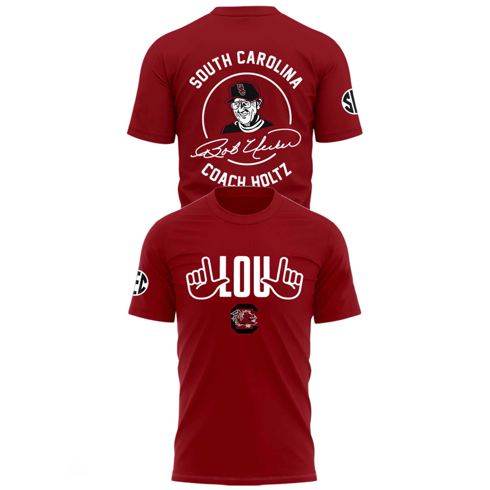 The design combines the classic Gamecocks color scheme with a powerful tribute theme that fans will instantly recognize. The reverse features a portrait of Coach Holtz surrounded by clear typography and signature details for a personal touch. On the front, the LOVE hand logo combines the school spirit with a message of unity and pride. The black background helps the red and white elements stand out clearly, giving the shirt a strong yet respectful look.