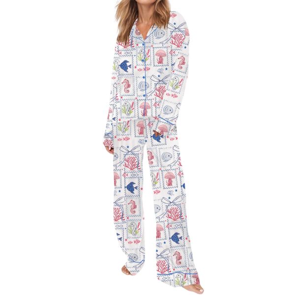 Coastal Aesthetic Satin Pajama Set For Women showcases a carefully curated collection of coastal illustrations in an appealing grid pattern. The artistic design features colorful sea creatures such as tropical fish, seahorses and starfish alongside classic nautical elements such as shells, lighthouses, anchors and sailboats. The crisp white background highlights the vibrant blues, corals and greens of the nautical motif, creating a fresh and sophisticated look reminiscent of vintage postcards of the seaside.