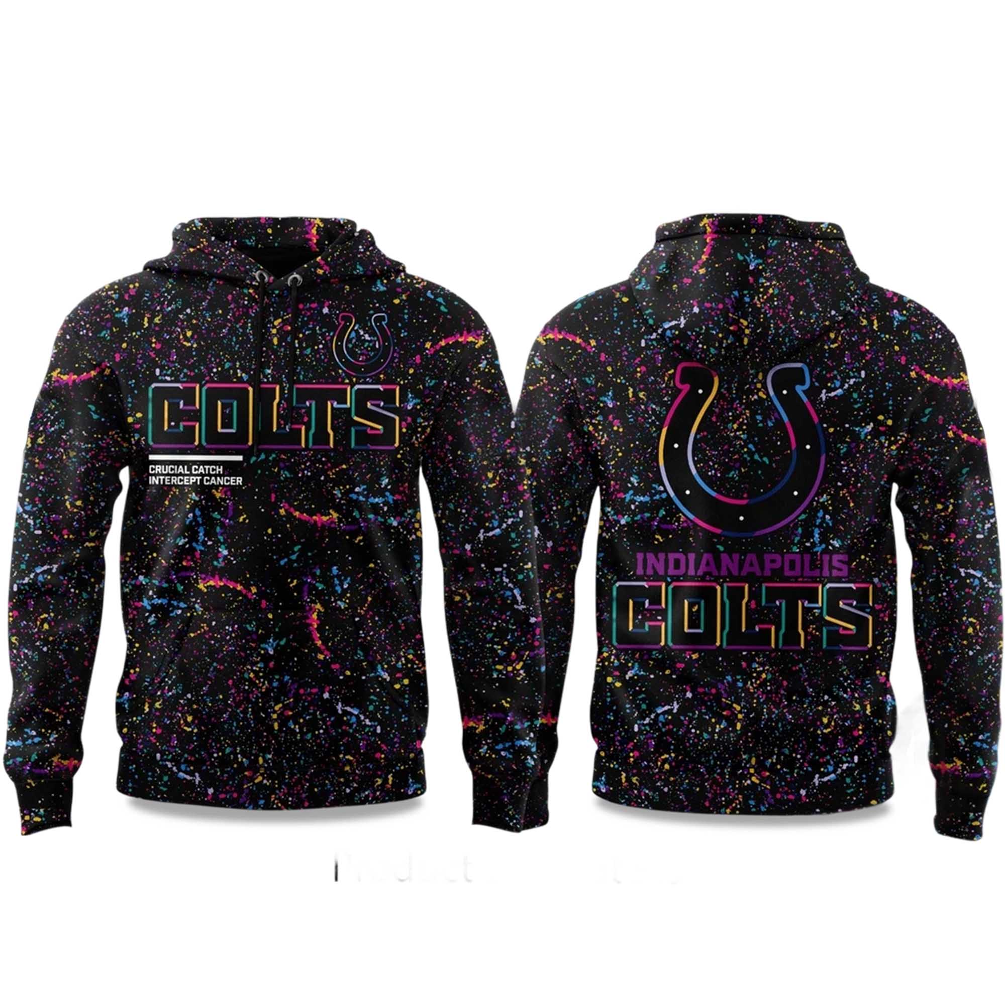 Every detail of this hoodie is designed to stand out. The black base creates a striking contrast with the rainbow fish scale effect, symbolizing the unity of many colors in cancer awareness. The front features “COLTS” in capital letters with the Crucial Catch logo underneath, while the back features “INDIANAPOLIS COLTS” underneath an oversized horseshoe logo. A roomy hood and soft inner lining provide comfort for chilly game nights or everyday wear.