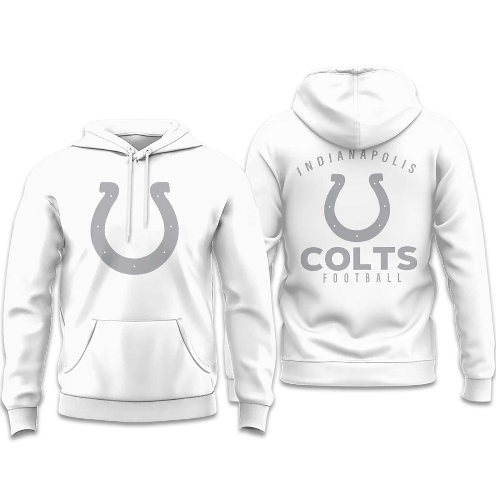 The Colts White Out 2026 Hoodie features a smooth white color combined with subtle grey accents for a balanced and premium look. The front is highlighted by the Colts horseshoe logo, while the back features “Colts Football” with Indianapolis above. Designed for everyday comfort, This hoodie features a relaxed fit, an adjustable hood, and front pockets, ideal for stadium nights, casual wear, or travel.