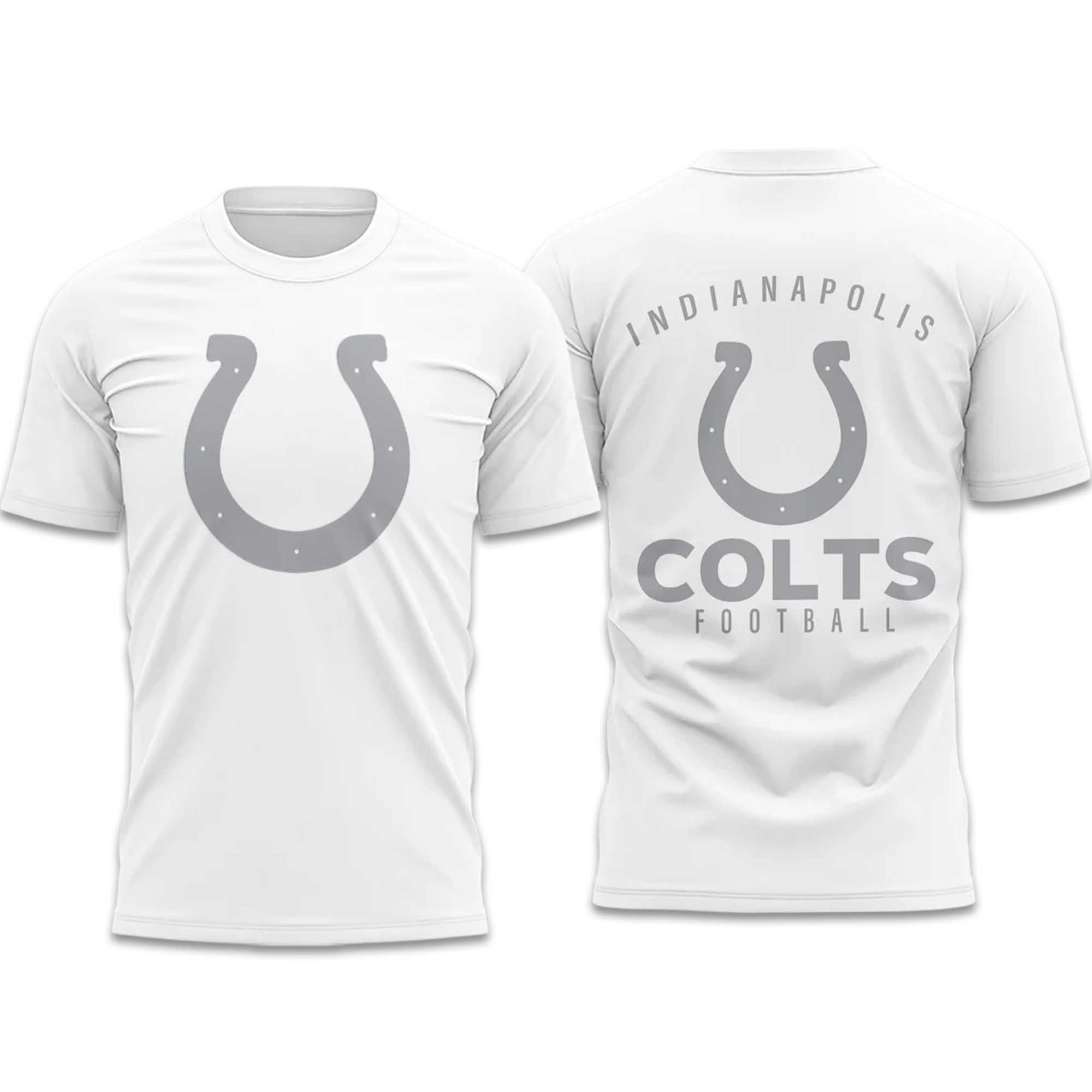 The Colts White Out 2026 Shirt boasts a simple yet powerful design. The front features the iconic horseshoe logo in a light grey tone, centrally placed and easily recognizable. The back displays the words “Indianapolis Colts Football,” creating balance and pride without being overwhelming. The white background makes the shirt look clean, modern, and easy to pair with jeans, shorts, or other cheerleading attire.