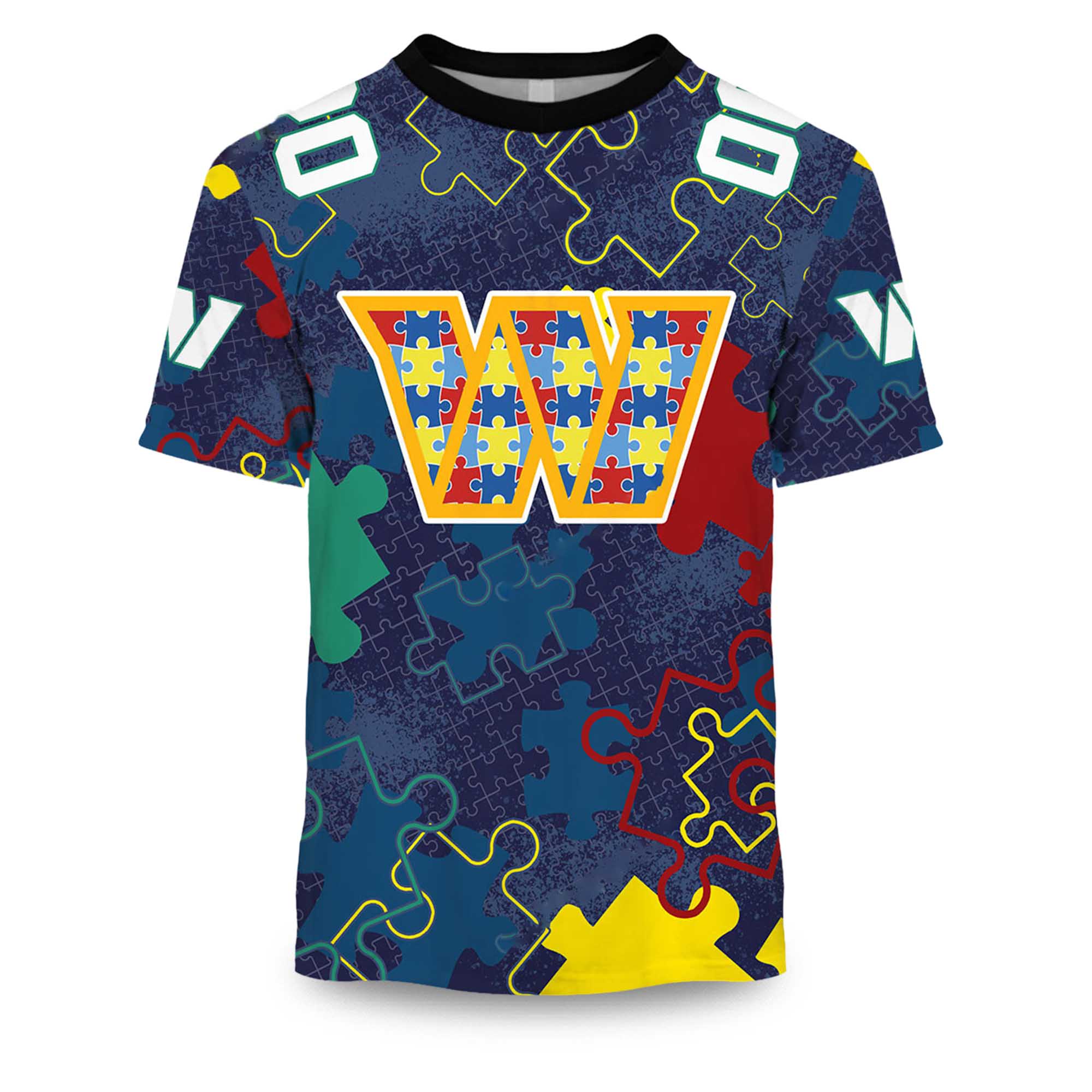 The jigsaw puzzle pattern is inspired by autism spectrum awareness symbols, representing uniqueness, connection, and understanding. Each shape and color reflects how differences combine to create something meaningful. Combining this idea with the Commanders’ team imagery creates a shirt that embodies meaning and unity.