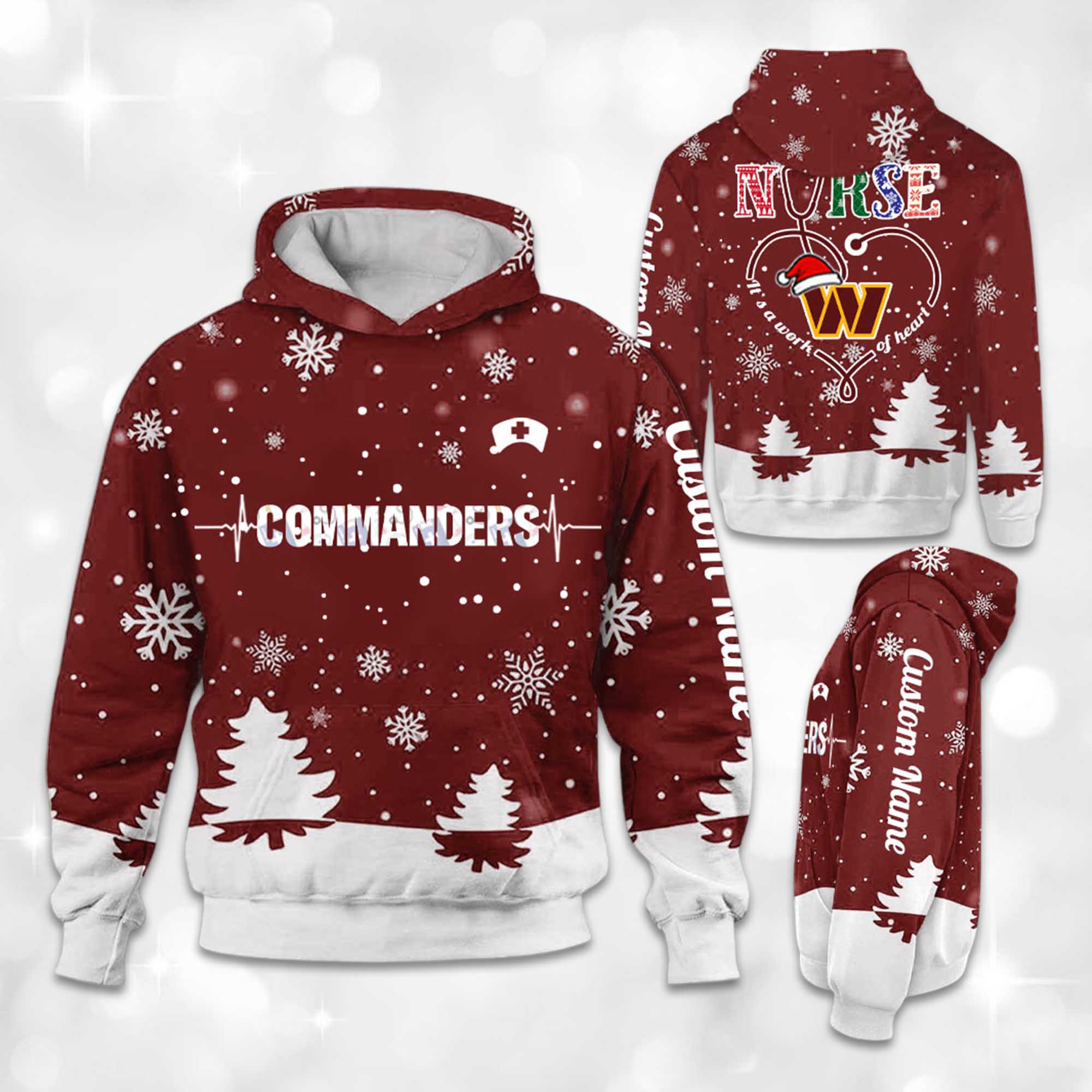 The Commanders x Nurse Christmas Football Hoodie stands out with its deep burgundy color, adorned with falling snowflakes and winter trees, instantly creating a festive atmosphere. The front showcases the Commanders’ powerful soccer energy, while the back features a nurse heart design, adding emotional depth. Soft, warm, and easy to wear, this hoodie is perfect for chilly days, holiday gatherings, and relaxing winter moments.