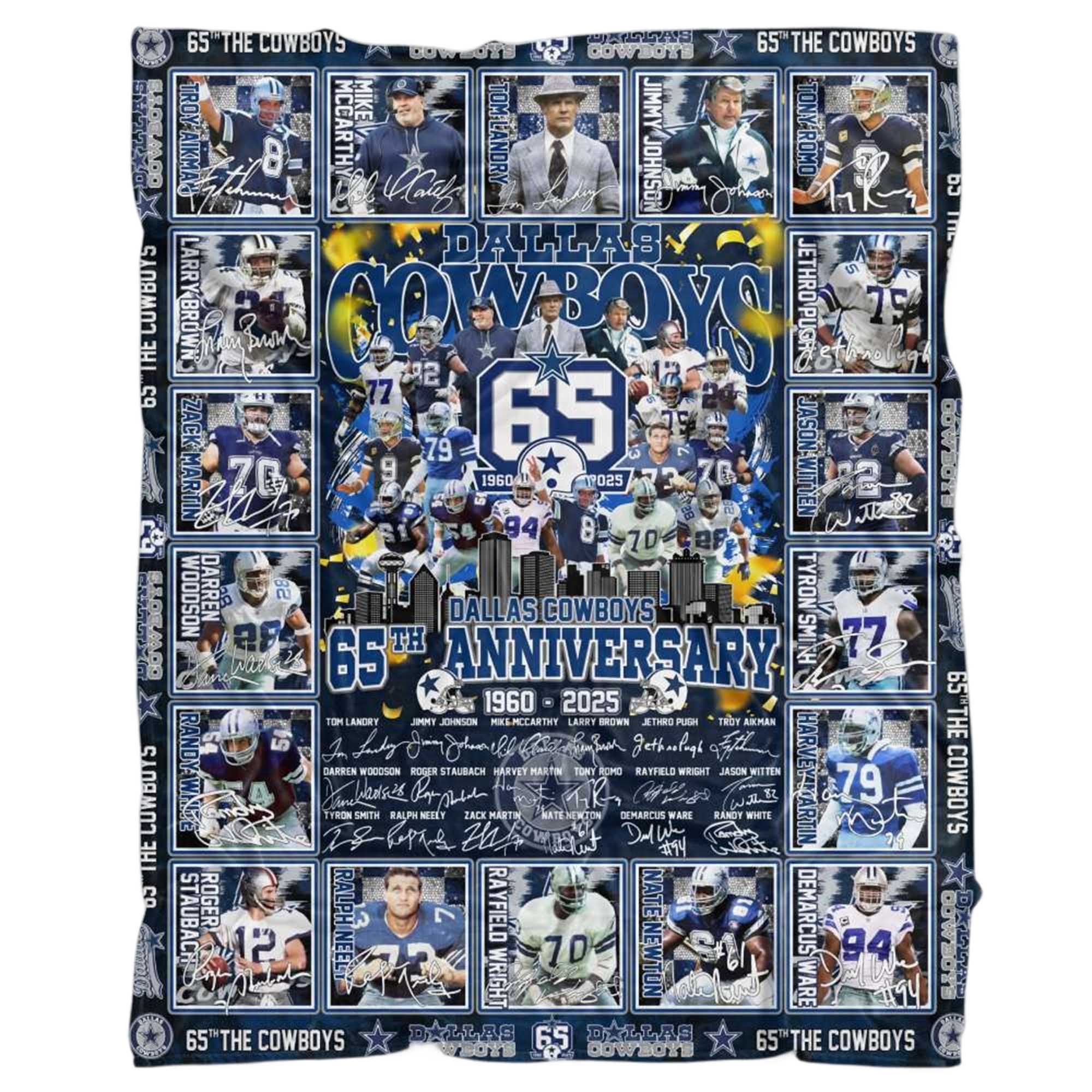 Cowboys 65th Anniversary 1960-2025 Fleece Blanket honors six decades of unforgettable moments, legendary players, and iconic coaches. Designed with a mix of historic athletes, team signatures, and imagery, this blanket captures the spirit of America’s Team. It’s cozy enough for game nights but stylish enough to display proudly at home.