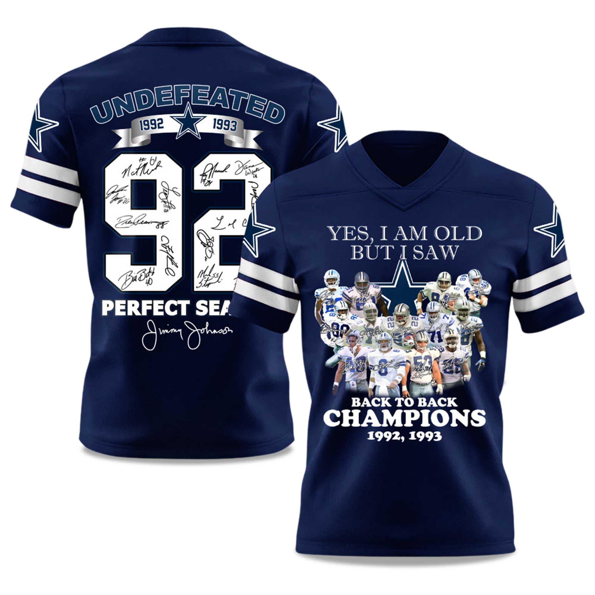 This jersey features a bold navy blue colorway with a white jersey and bold typography that features the words “Back to Back Champions.” The front features a collage of players in championship form, while the back pays tribute to perfect seasons with the iconic No. 92 and signatures of legendary players. The lightweight, breathable fabric keeps you comfortable from the stadium to the streets, while the classic V-neck adds a modern yet nostalgic touch to any Cowboys fan.