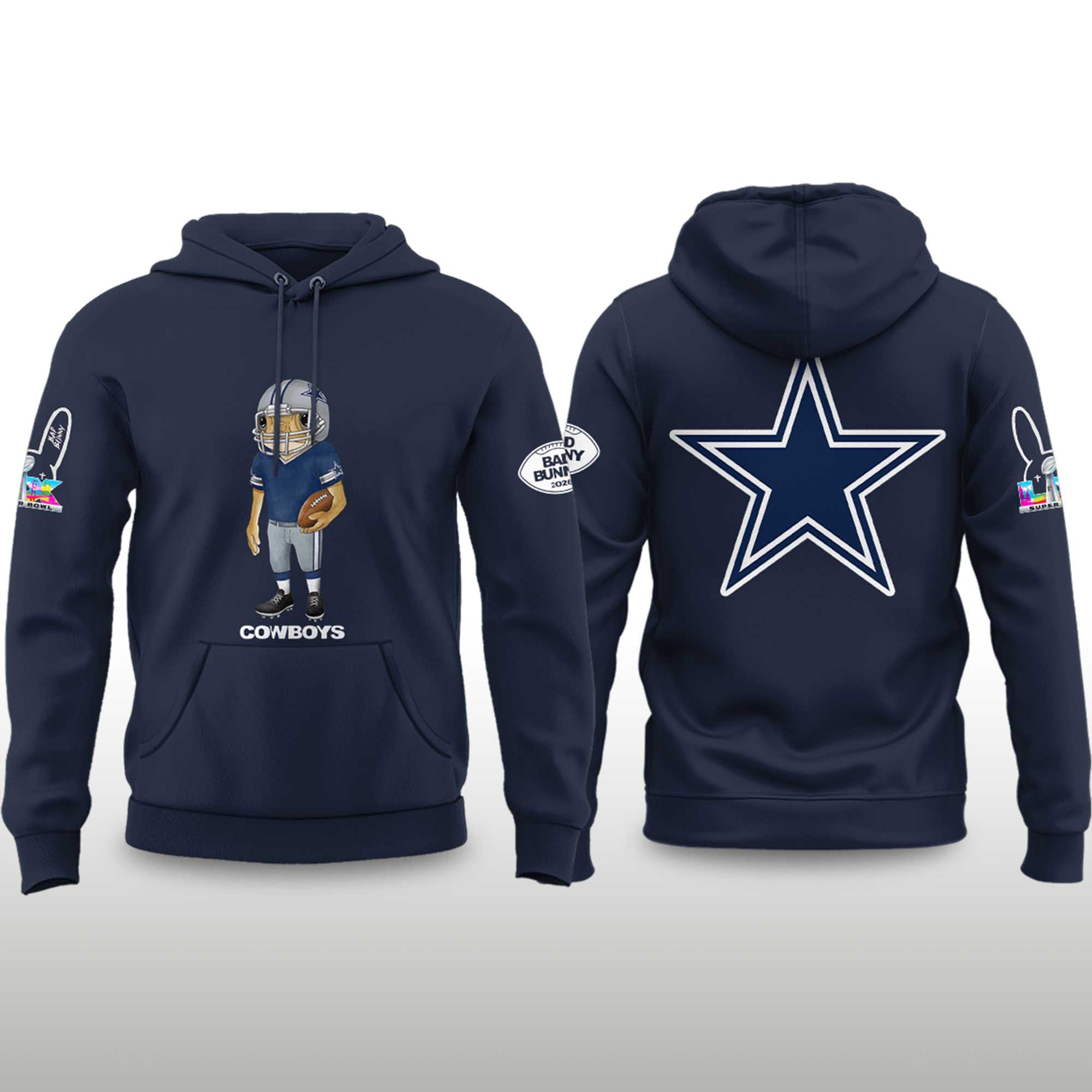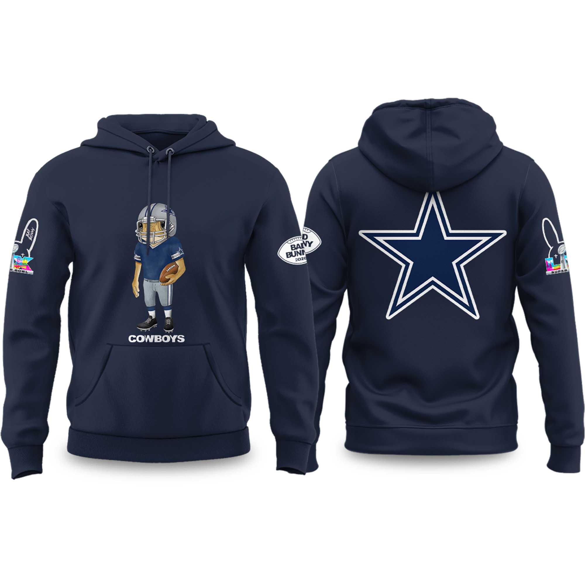 As the road to Super Bowl 2026 intensifies, fan fashion is becoming more expressive than ever. The Cowboys Bad Bunny 2026 Super Bowl Concho Football Hoodie reflects this trend by blending Dallas Cowboys tradition with culture energy. From the imagery, the deep navy blue color, the prominent star logo on the back, and the playful soccer character on the front create a fresh, confident, and recognizable look.