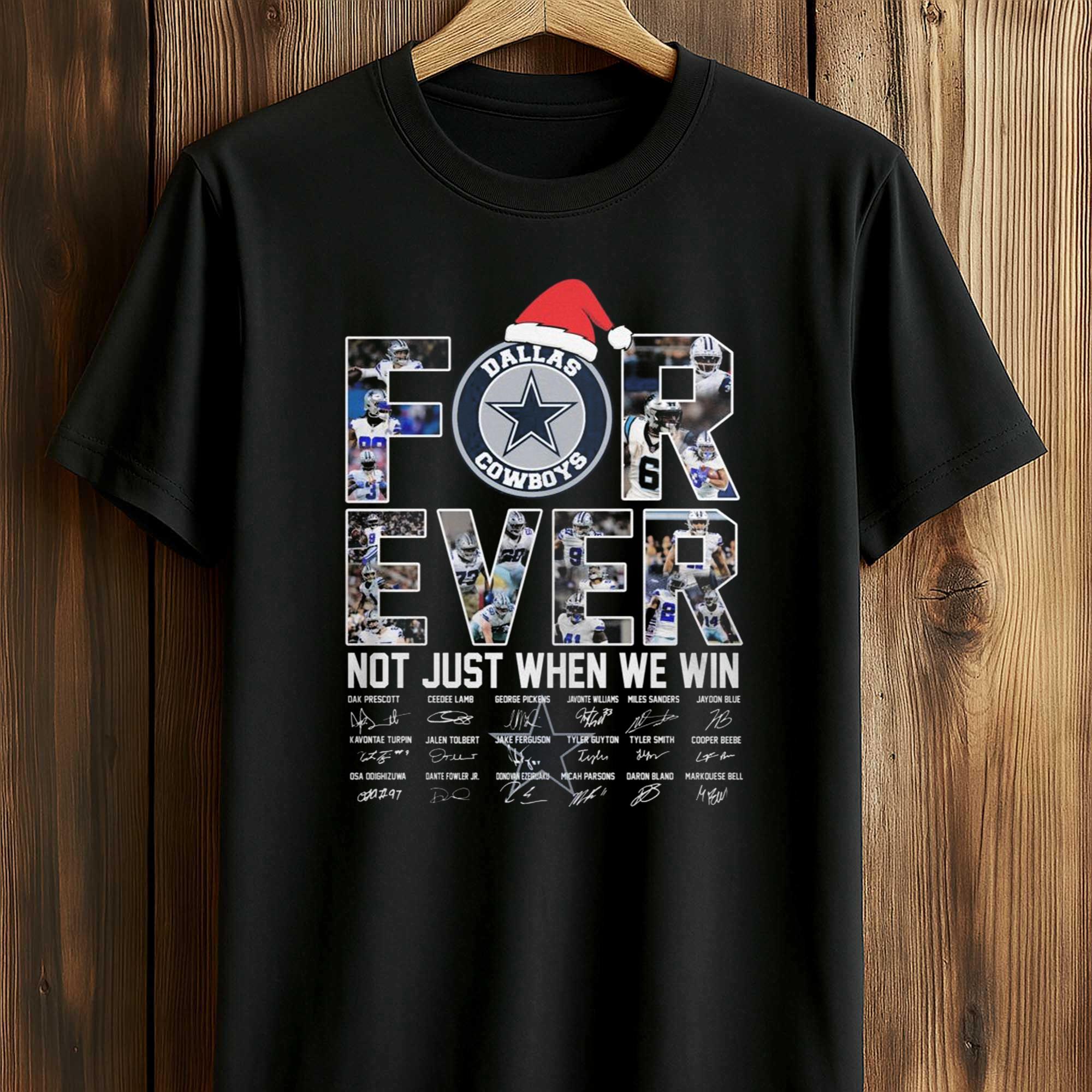 The Cowboys Forever Not Just When We Win Christmas Shirt is gaining attention for its heartfelt message and holiday flair. The design emphasizes fan loyalty, combining the Cowboys logo, player photo, and a colorful Santa hat. This is the kind of holiday tee that instantly makes its mark warm, colorful, and full of team pride.
