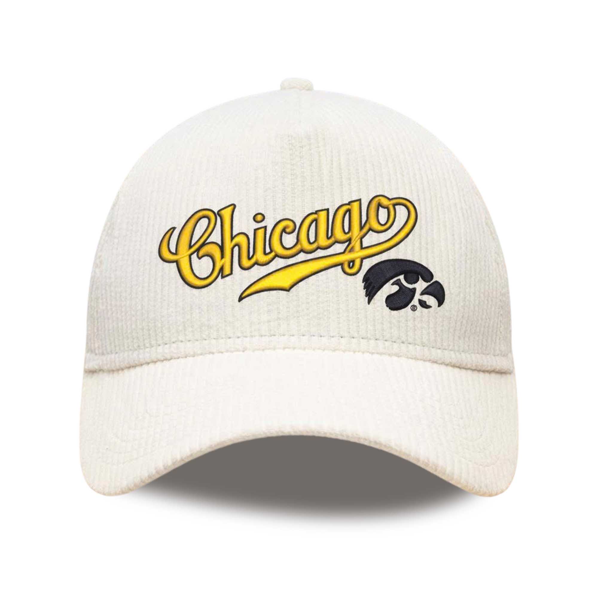 The included Cubs University of Iowa Cap 2026 Giveaway features a soft cream-colored top with prominent yellow “Chicago” lettering bordered on the front. Next to the lettering is the familiar Iowa Hawkeye logo, creating a harmonious blend of college identity. On the back, “Chicago Cubs” is embroidered in black above the adjustable buckle. The curved brim provides effective sun protection, while the sturdy construction helps the cap maintain its shape. The neutral background color highlights the black and gold details.