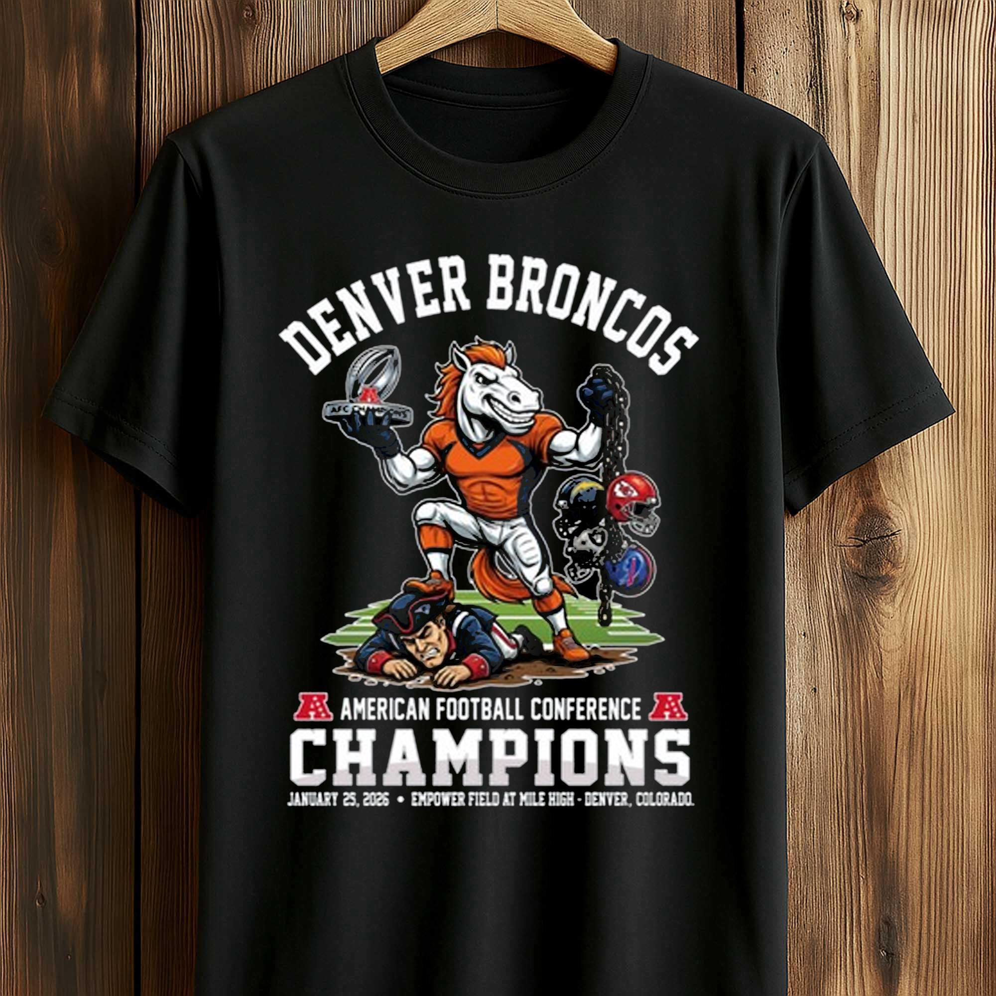 This shirt combines powerful imagery with a balanced composition. The Broncos mascot is centrally depicted, symbolizing strength and victory. The clear typography reinforces the championship message, while the overall design feels dynamic without being overly fussy. The shirt is easy to wear for extended periods, maintains its shape well, and keeps the print sharp after multiple washes.