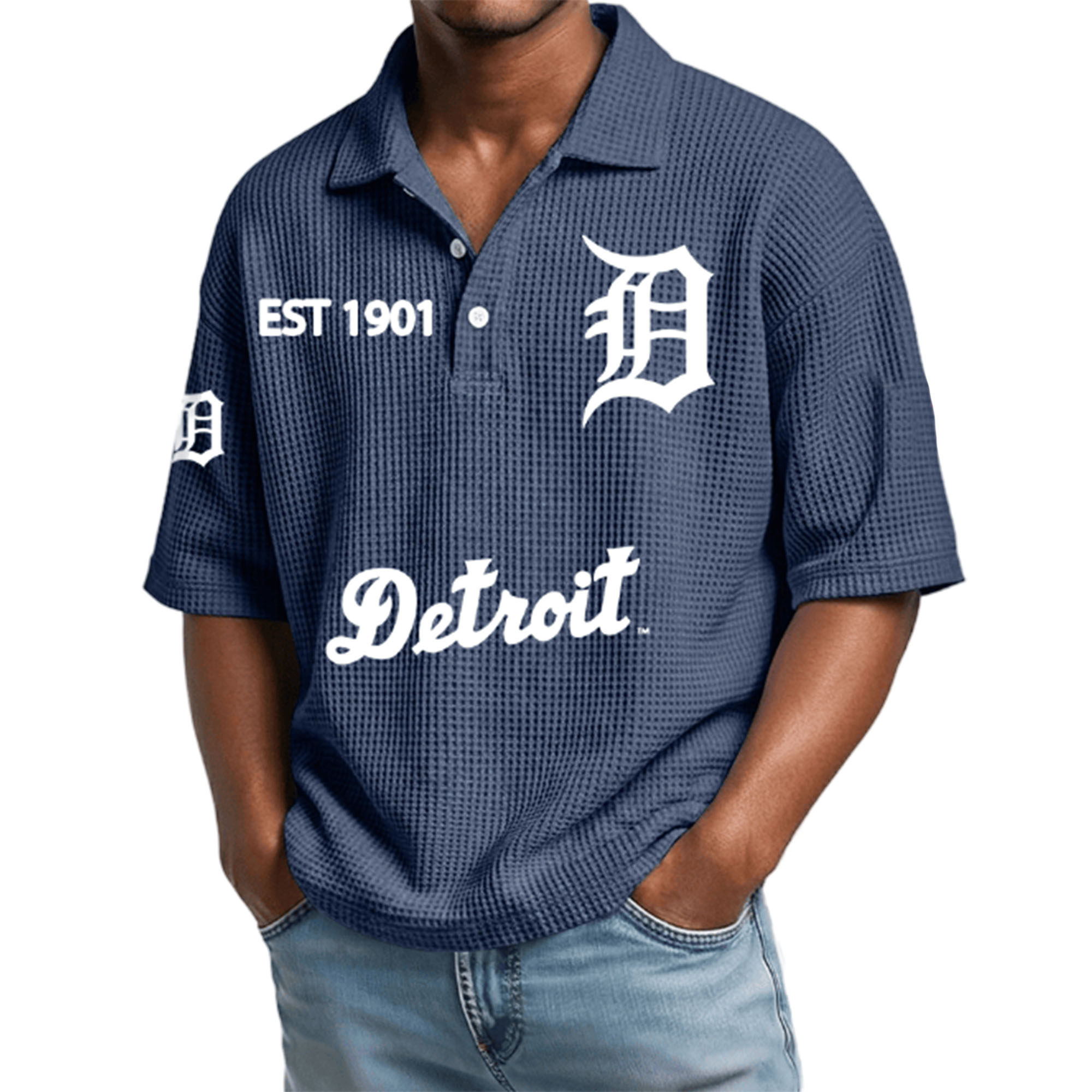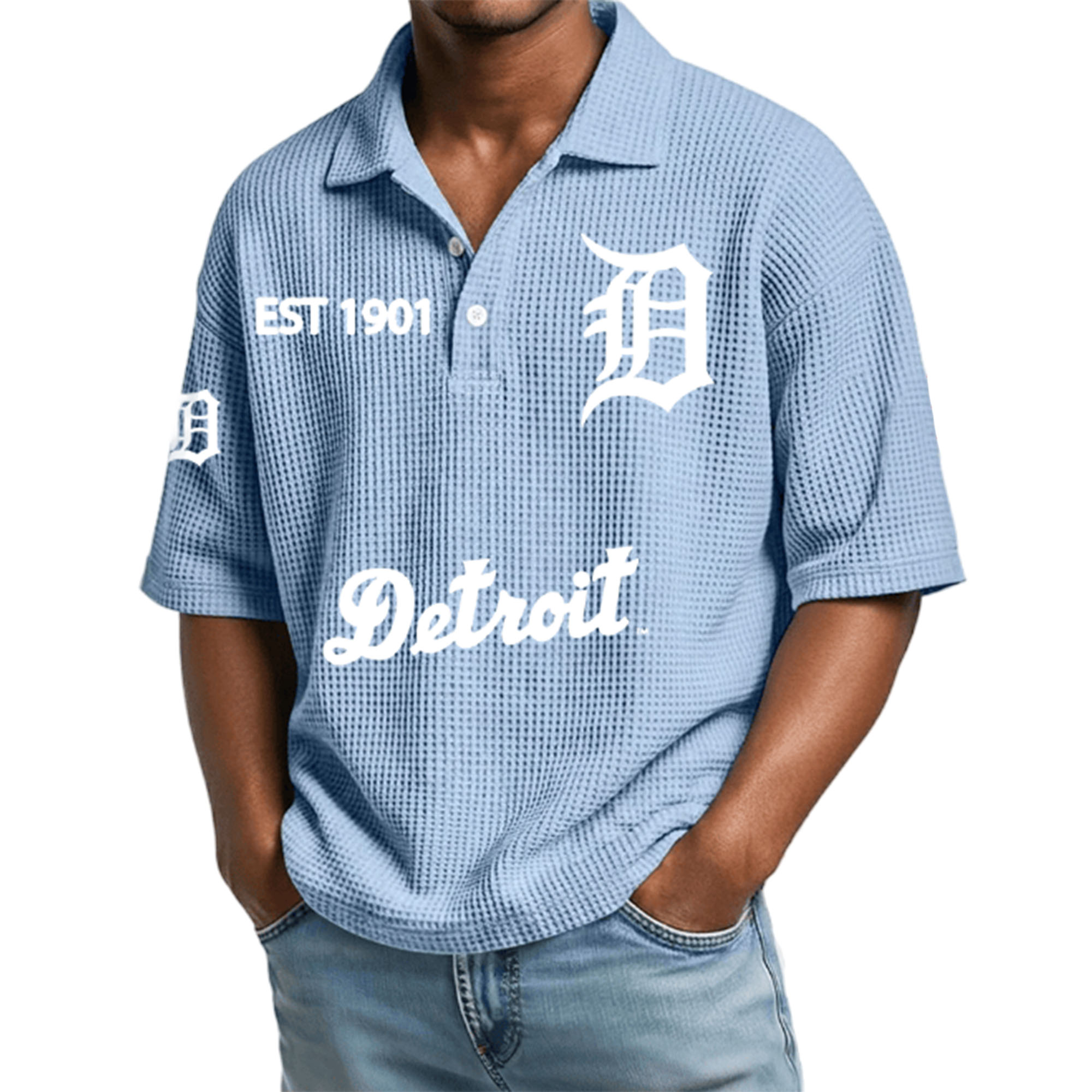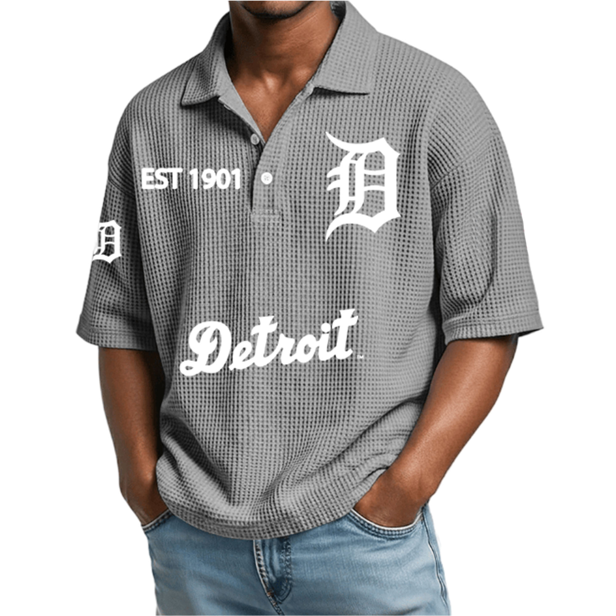 The Detroit EST 1901 Waffle Polo Shirt is becoming a favorite in everyday fashion thanks to its simple look and city-inspired details. The prominent D logo and Detroit lettering create a strong, distinctive identity without being overly flashy. With its textured and comfortable fabric, this polo shirt is perfectly suited to everyday fashion trends, especially for those who prefer simple yet stylish outfits.
