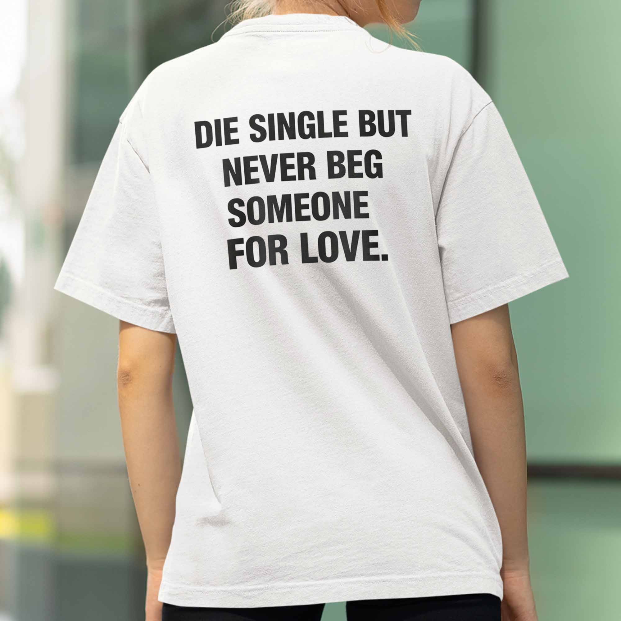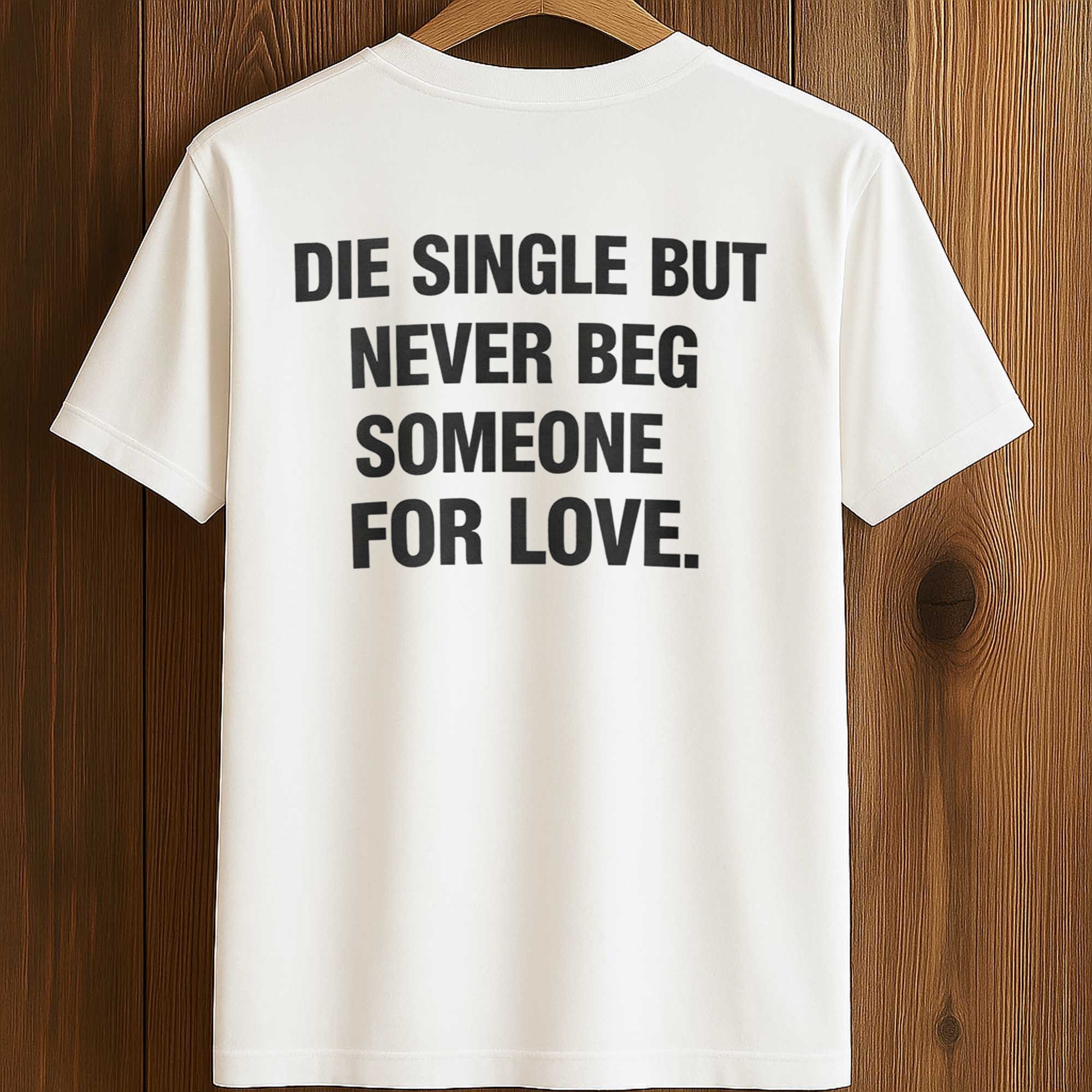 The Die Single But Never Beg Someone For Love Shirt stands out with its pristine white background and bold black lettering. The message is direct, confident, and easily readable from afar, perfect for expressing personality without saying a word. The relaxed fit allows for everyday wear, while the minimalist design makes it easy to pair with jeans, shorts, or layered streetwear.