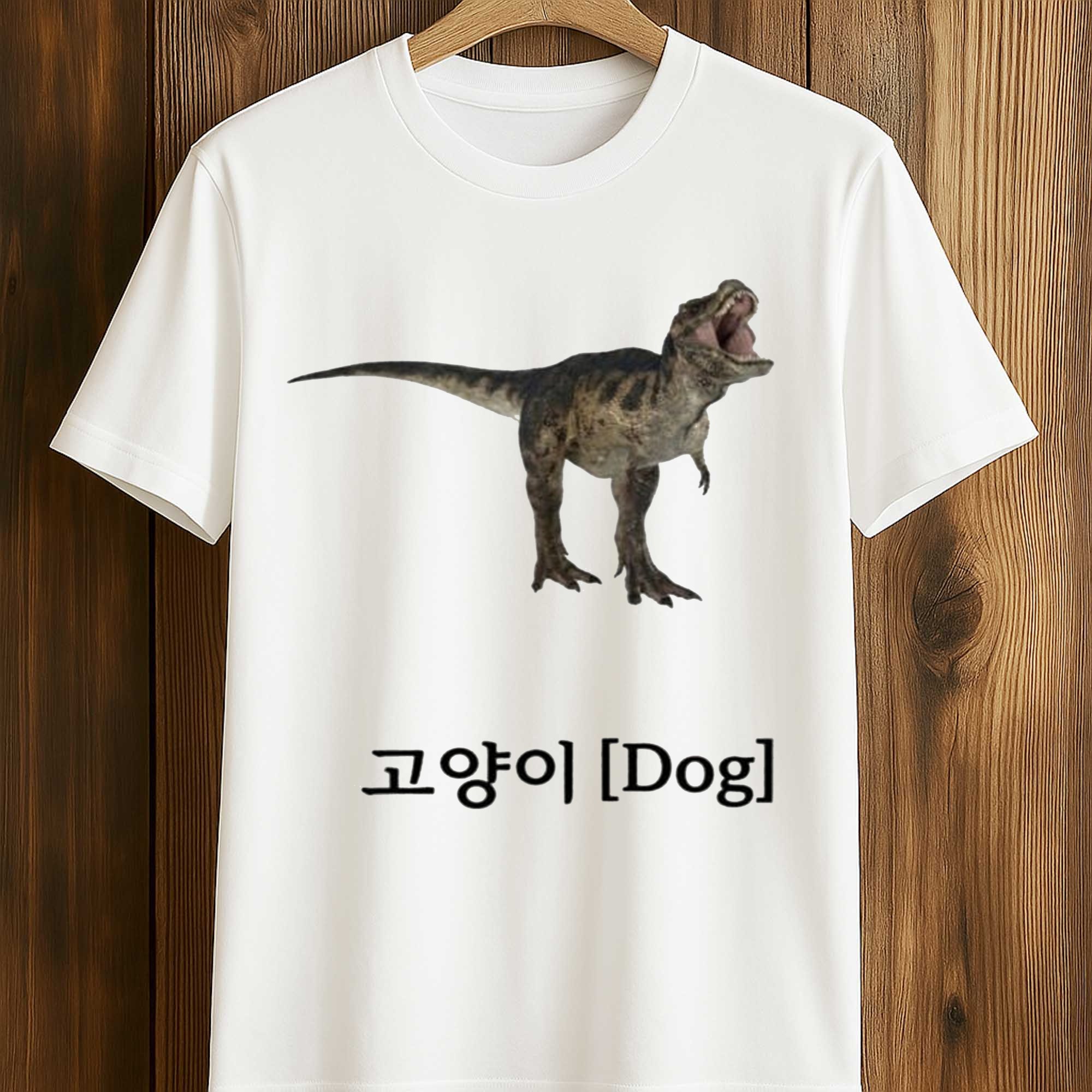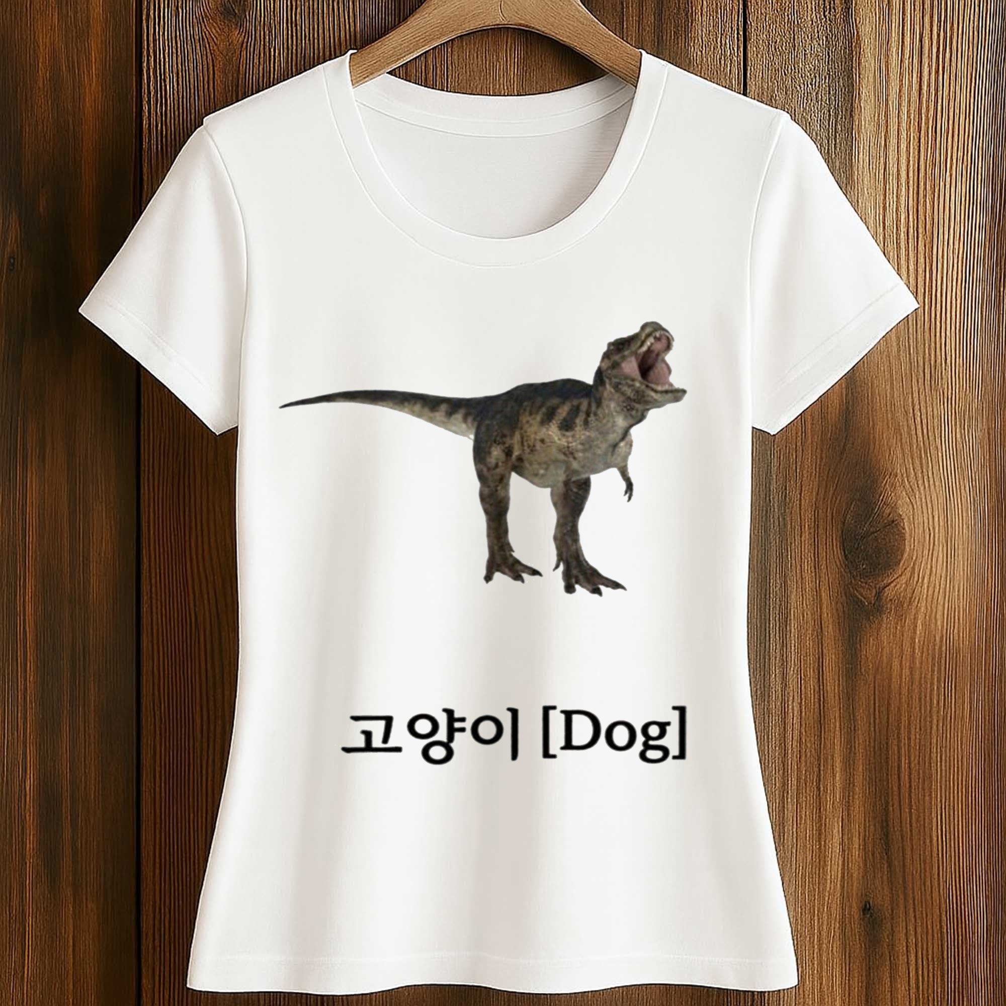 This shirt features a vibrant dinosaur image placed above the Korean text 고양이 along with the English label Dog, creating a playfully mismatched effect. The contrast between the image and text adds humor and infectious appeal to the design. The clean white background makes the image stand out, while the balanced and modern layout gives the shirt a stylish look. It combines meme culture, minimalist style, and Korean-inspired visual trends.