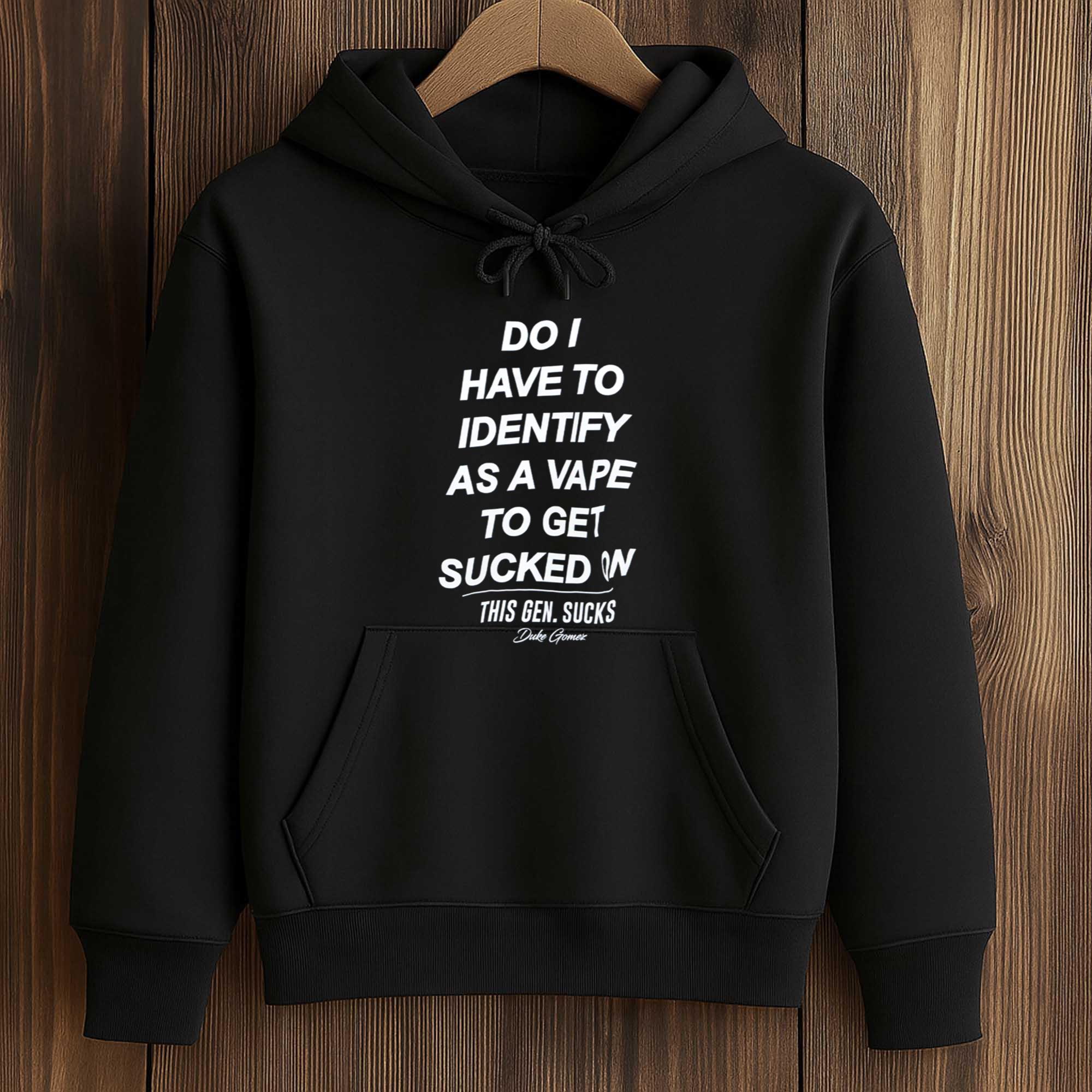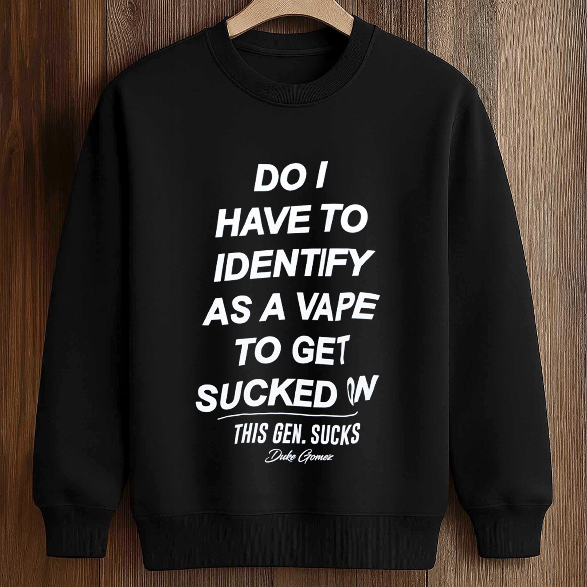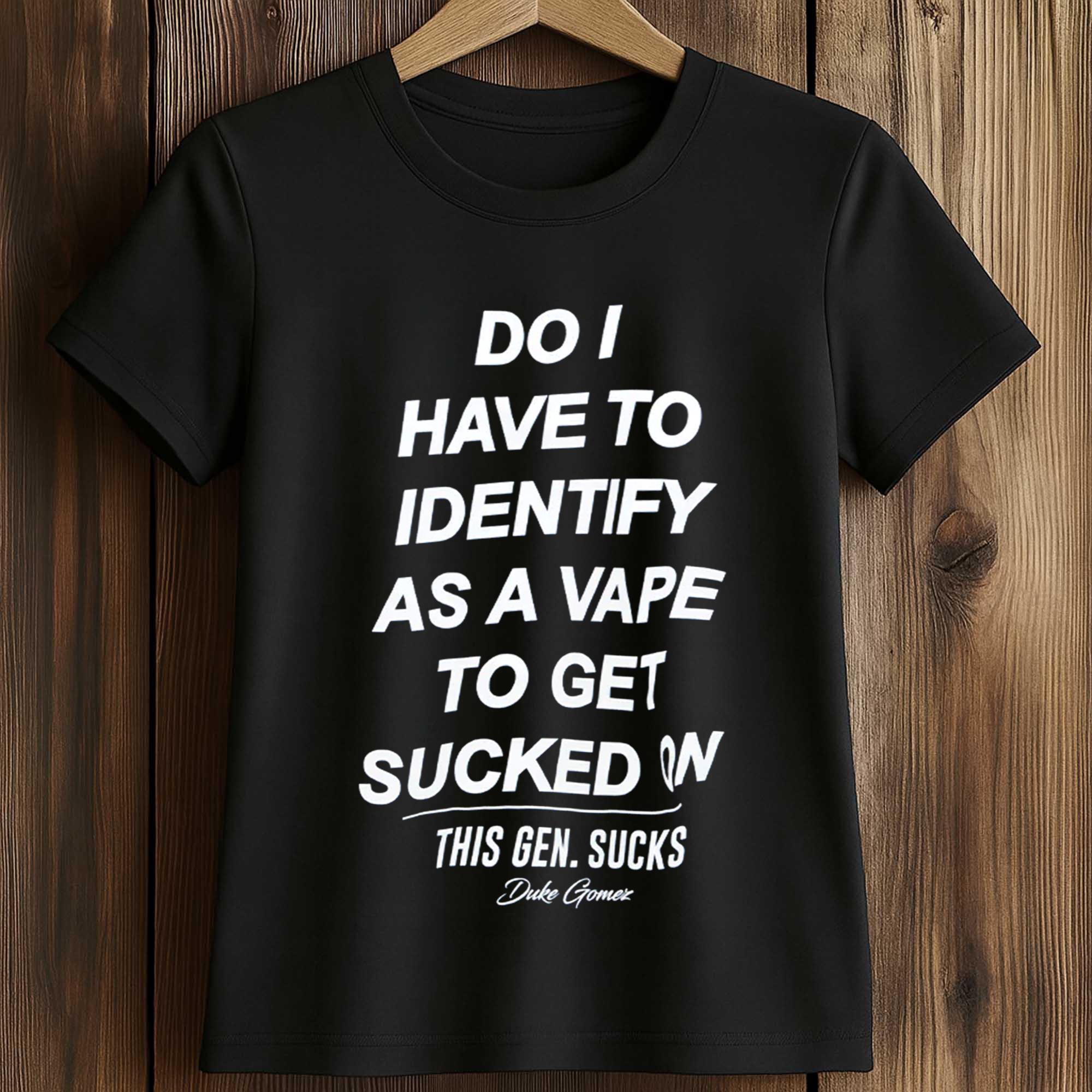 Do I Have To Identify As A Vape To Get Sucked On This Gen. Sucks Duke Gomez Shirt is making waves thanks to its sharp humor and uncompromising tone. Built on bold, stacked typography, the design reflects modern satire and commentary on generational culture.