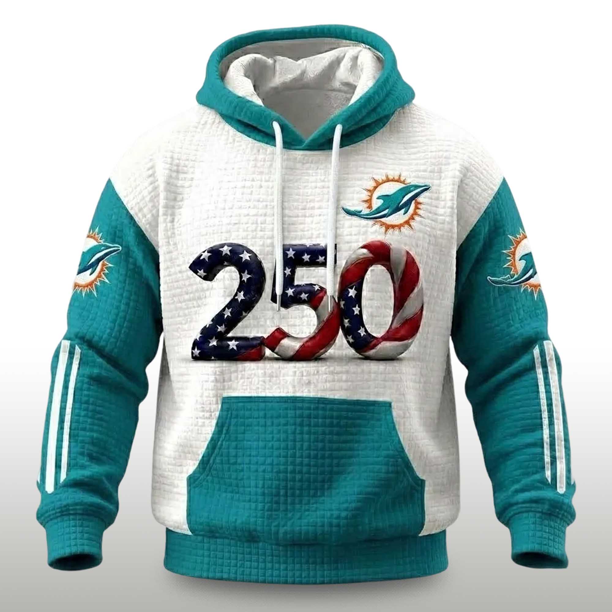 The Dolphins America’s 250th Anniversary Waffle Hoodie is a standout product for fans who love strong style and meaningful moments. Designed to honor the upcoming 250th anniversary of the United States, this hoodie combines patriotic symbolism with the unmistakable Miami Dolphins spirit. Featuring a 250 motif inspired by the American flag, classic turquoise accents, and the team logo, it embodies the excitement of a historic national celebration while remaining true to the sport.
