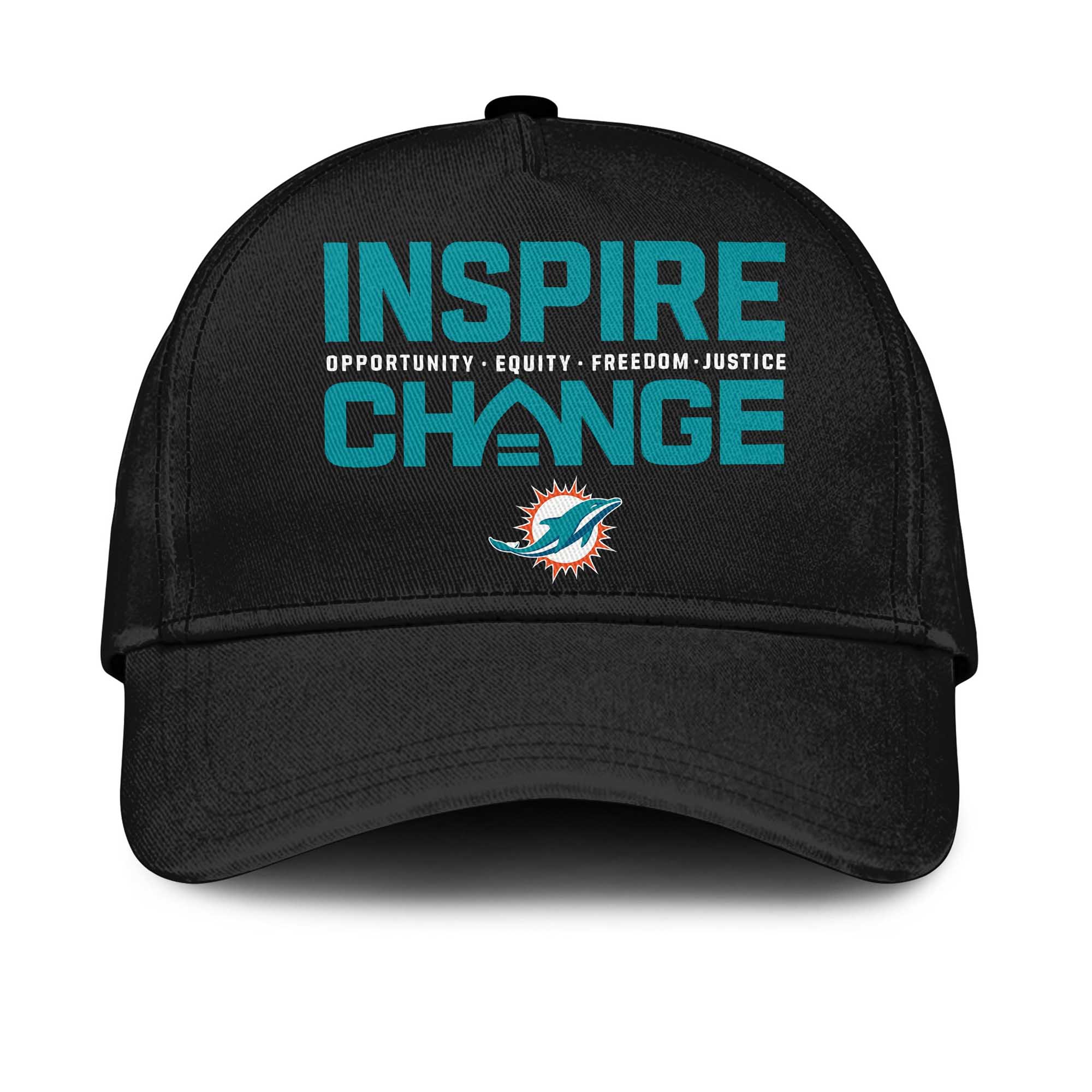The front displays the bold turquoise “Inspire Change” lettering combined with the Dolphins logo, creating a modern and sophisticated statement. On the back, the overlapping lettering highlights opportunity, fairness, freedom, and justice in a clear, easy-to-read manner. Ribbed cuffs and hem help maintain shape, while the black and turquoise color combination creates a fresh, striking look without being overly flashy.