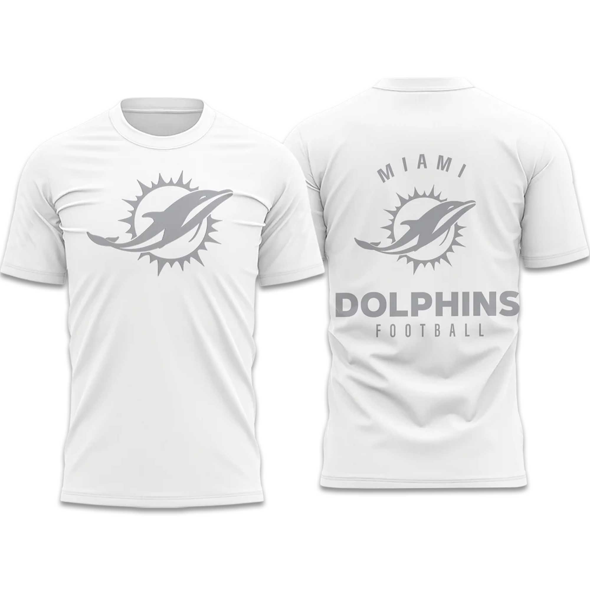 The Dolphins White Out 2026 Shirt a bright white background and a light grey Dolphins logo on the front. On the back, the words “Miami Dolphins Football” are clearly and symmetrically placed, creating depth while maintaining a simple design. Overall, the shirt gives a fresh, dynamic, and easy-to-wear feel, whether you’re at the stadium or strolling down the street.