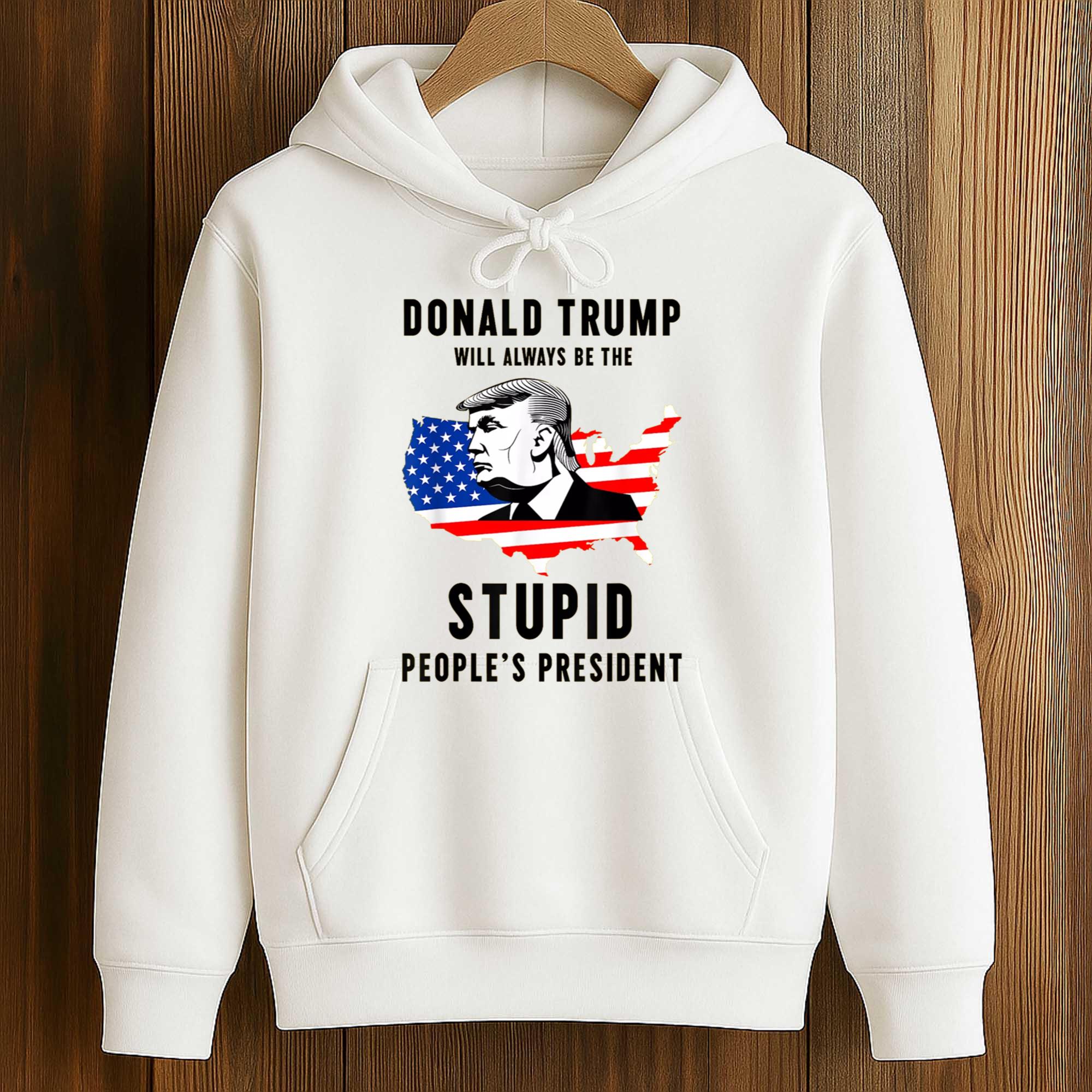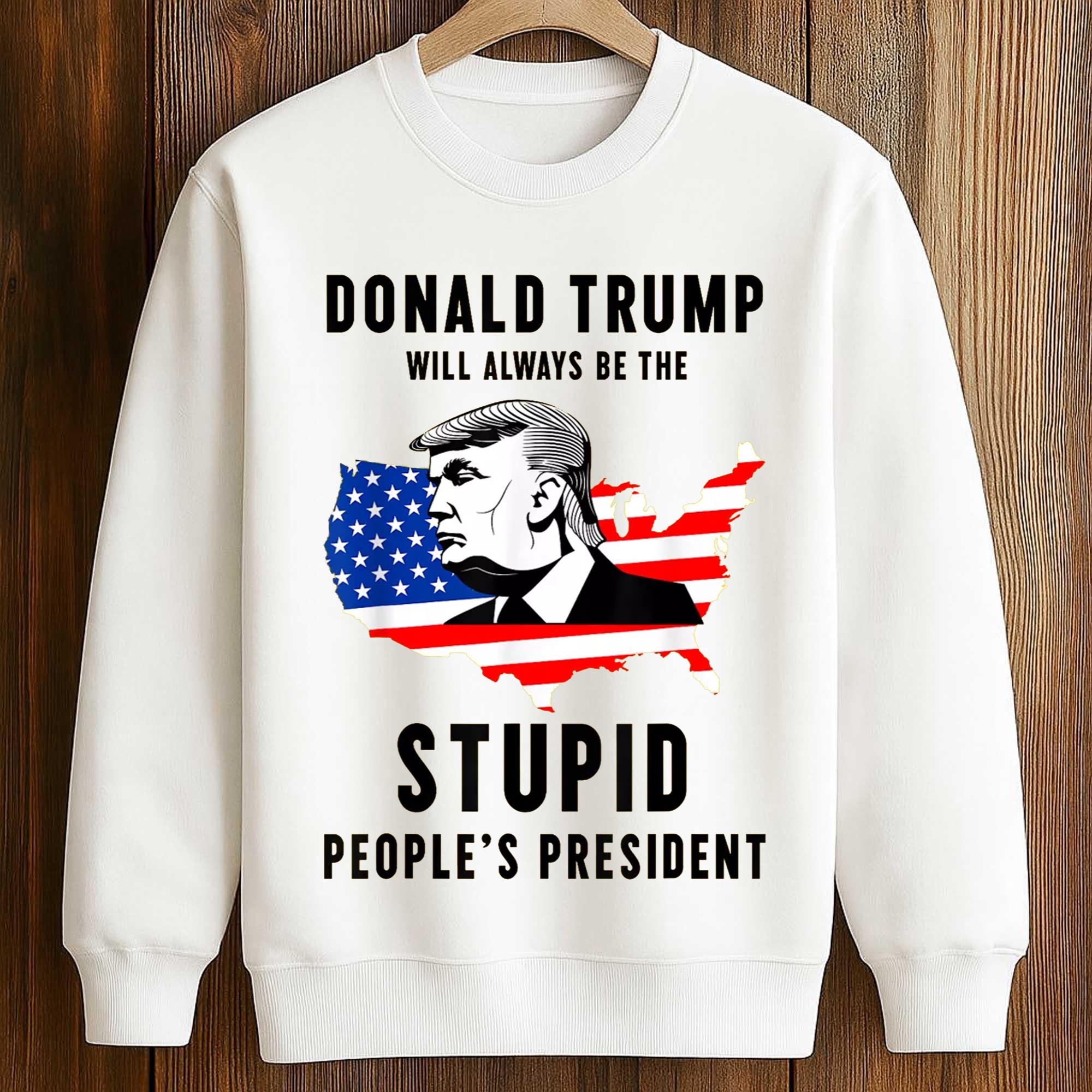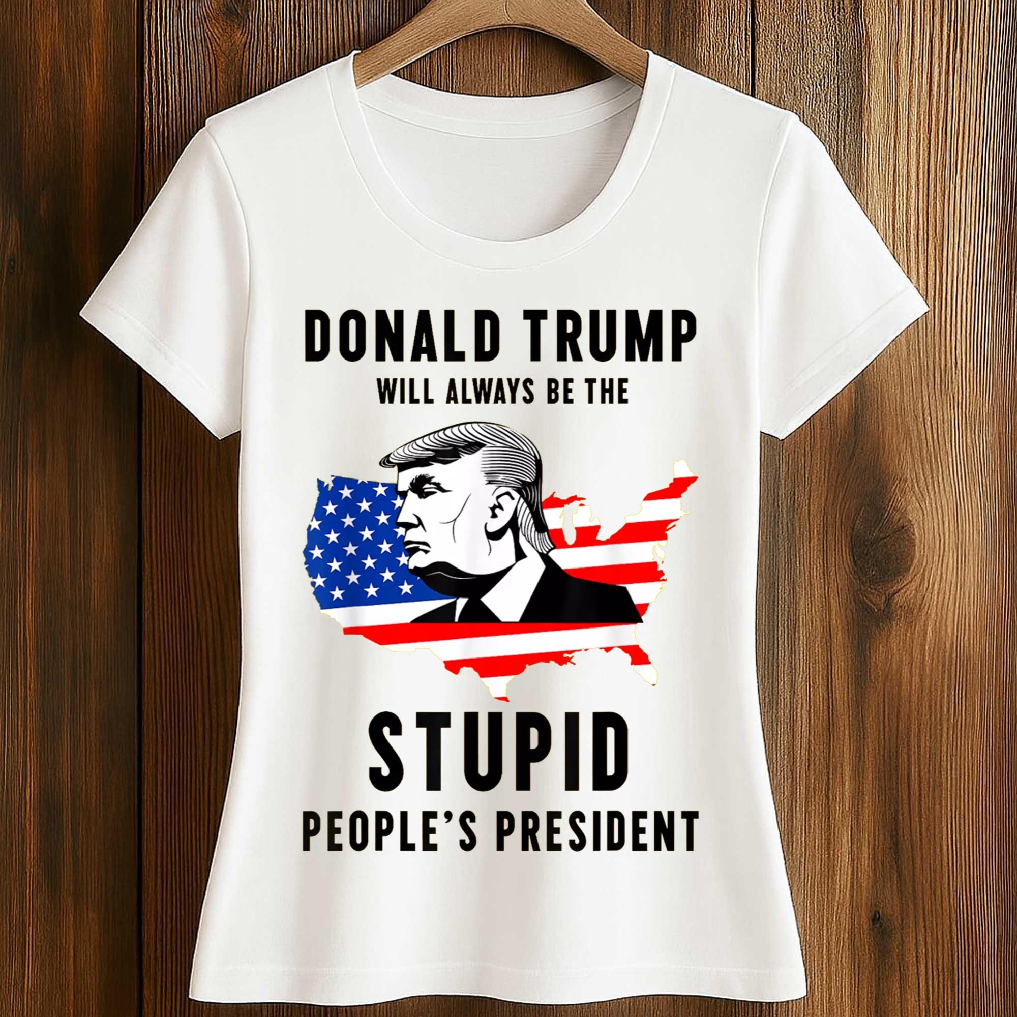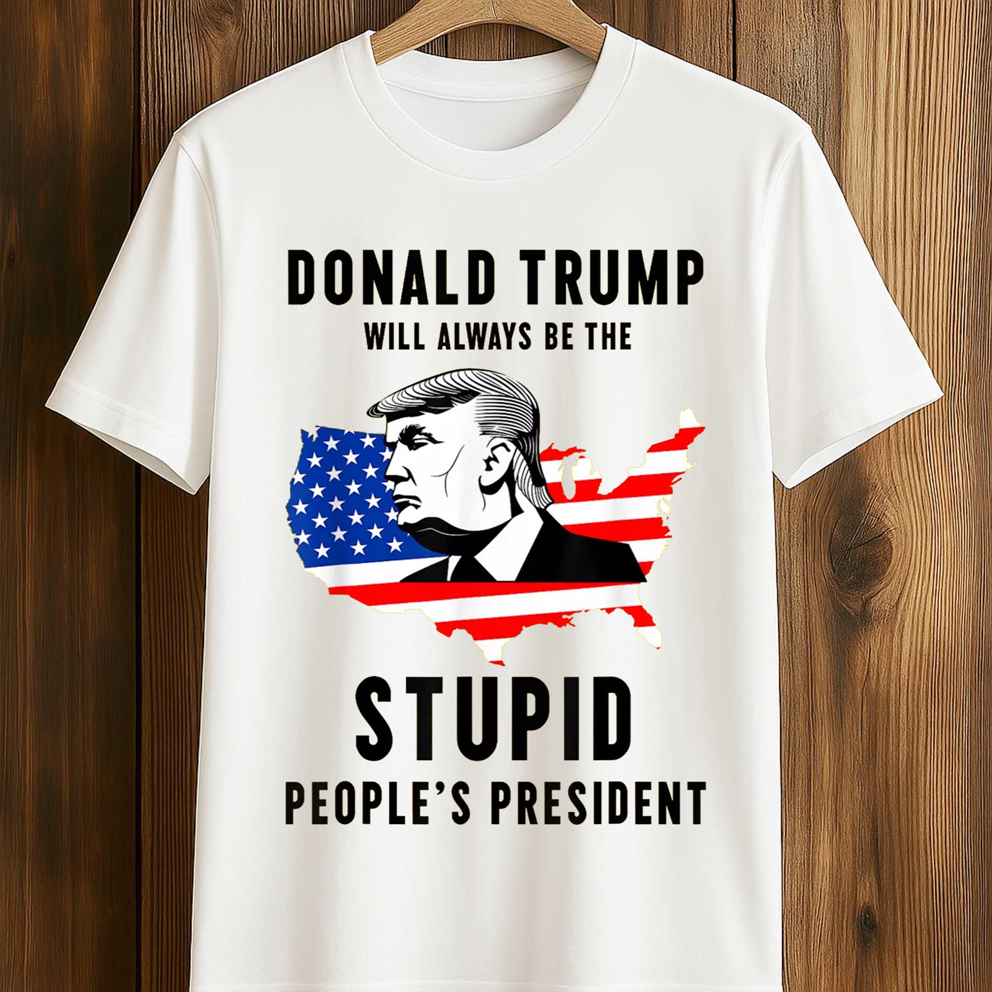 The bold graphic Donald Trump Will Always Be the President of the Stupid Shirt is a striking graphic t-shirt that combines political satire with bold street style. Featuring a stylized map of the United States adorned with the American flag and a portrait illustration, this design conveys a provocative message that sparks discussion. This shirt is for those who like to express their opinions through fashion while standing out with eye-catching imagery.