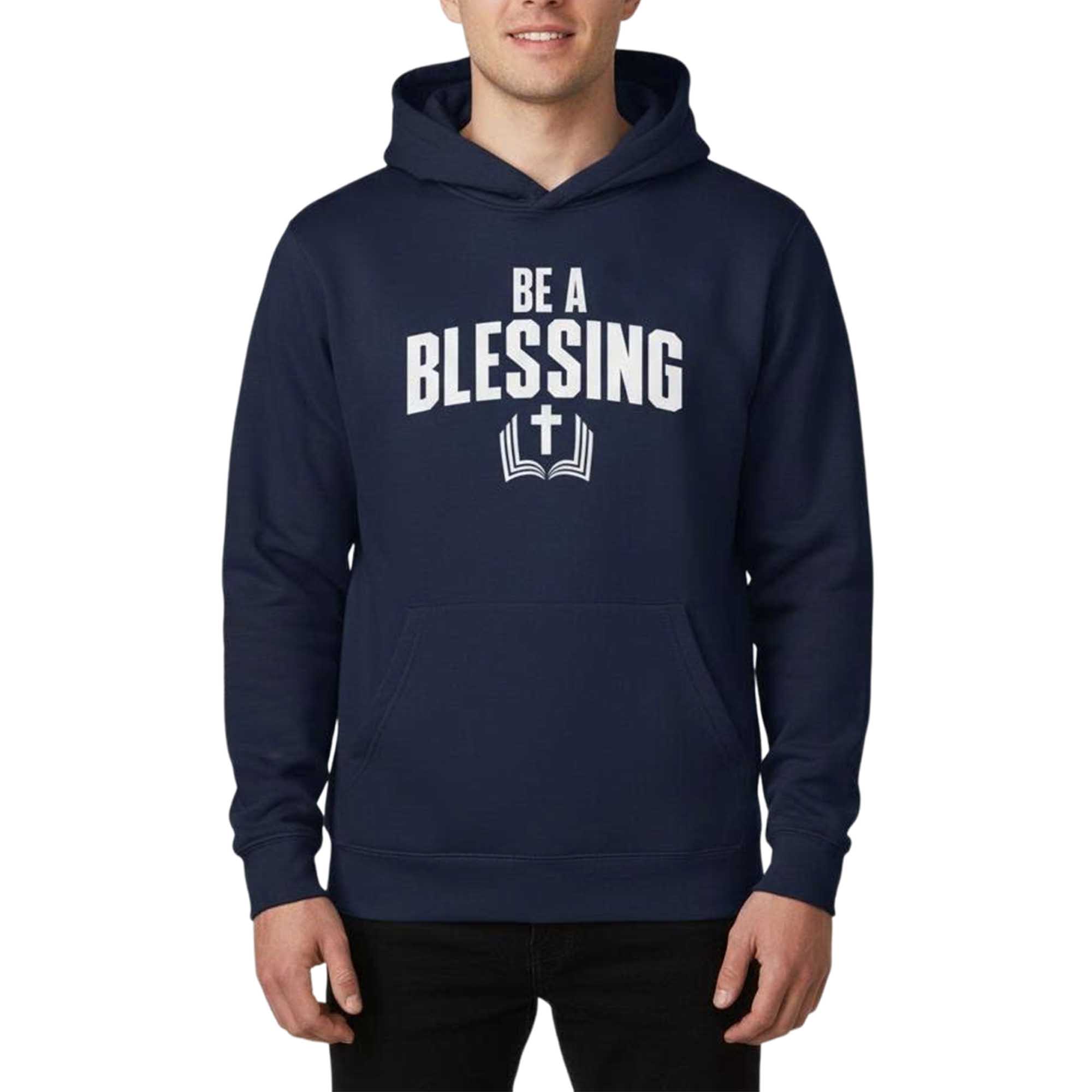 The navy blue colorway highlights the white pattern. The hood is easily adjustable, and the front pocket provides everyday convenience. The fabric is smooth, the print lasts through the wash, and the overall look stays neat whether paired with jeans, joggers, or tracksuit bottoms. This is a design that is both effortless and confident, giving the wearer a sense of purpose and positivity throughout the day.