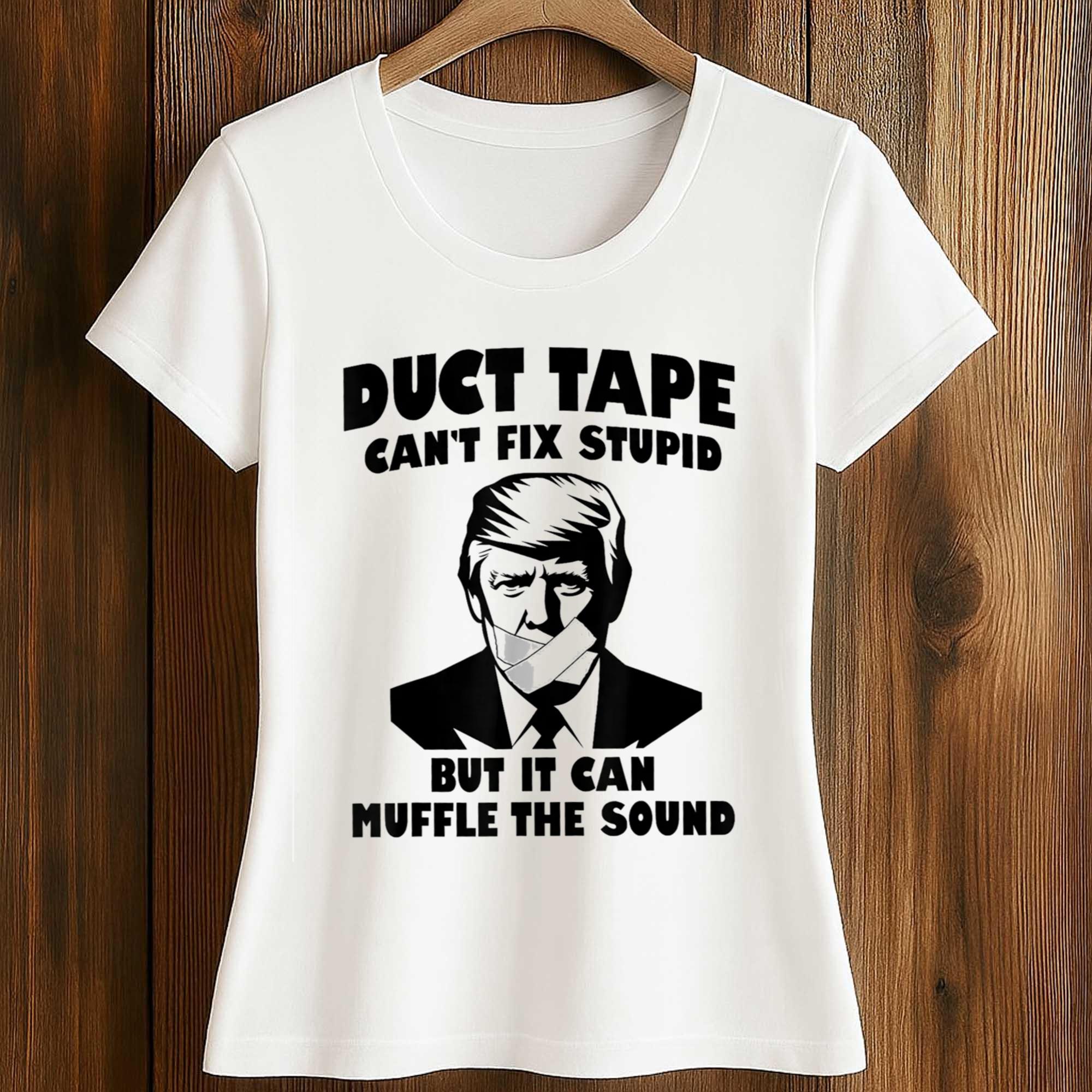 The Duct Tape Can’t Fix Stupid But It Can Muffle The Sound Trump Shirt features a crisp white background with high-contrast black typography and illustration. The front features a stylized portrait with tape across its mouth, surrounded by bold text above and below. The layout is balanced and easy to read from a distance, making the message clear while maintaining a clean and modern look.