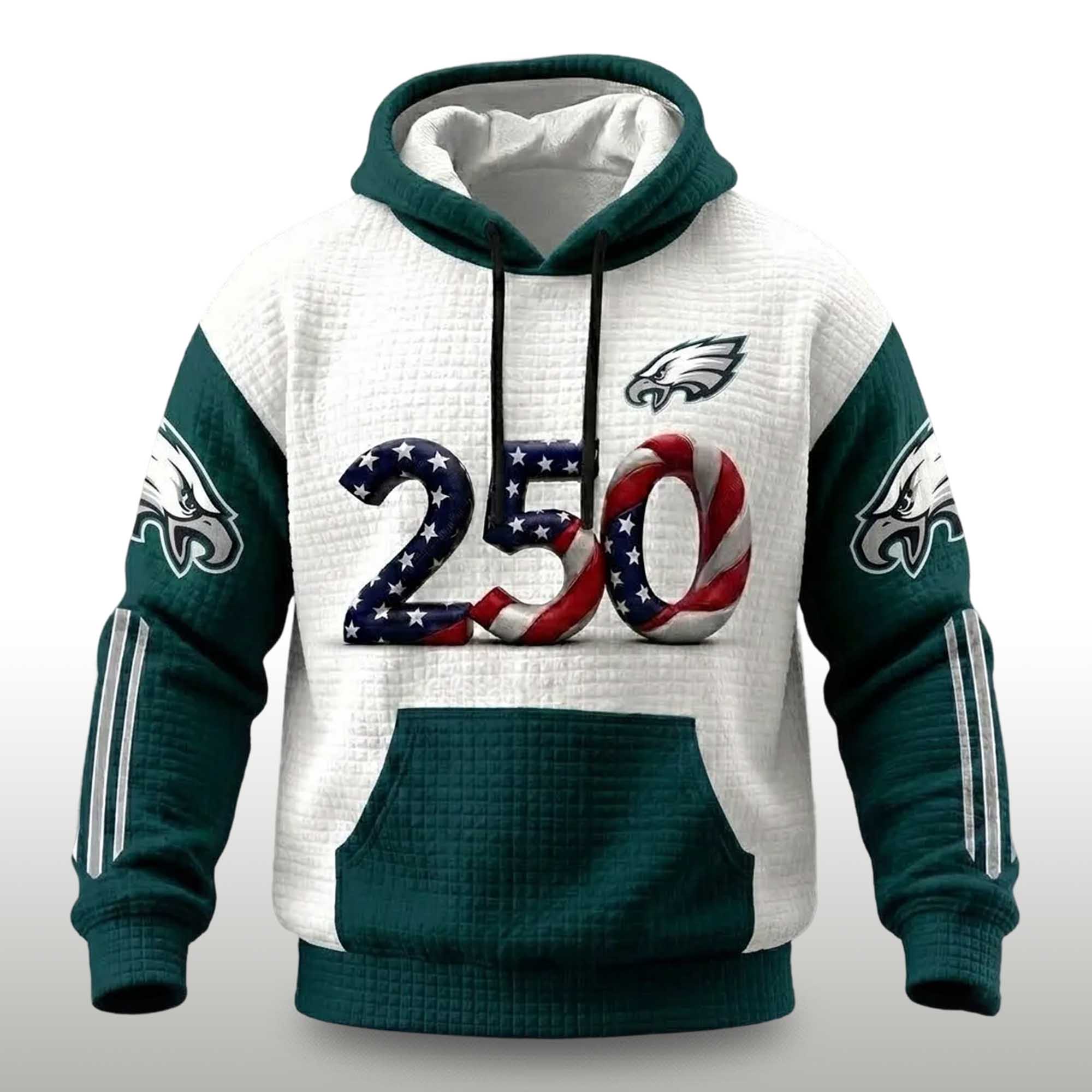 This hoodie combines the Eagles signature green, white, and black color scheme with patriotic details that instantly grab attention. The large 250 graphic on the front becomes the focal point, celebrating the founding of the United States while maintaining a sporty feel for the fans. Stripes on the sleeves add a dynamic touch, and multiple Eagles logos make the hoodie stand out from every angle. The waffle-knit fabric adds depth and a fresh look compared to typical hoodies.