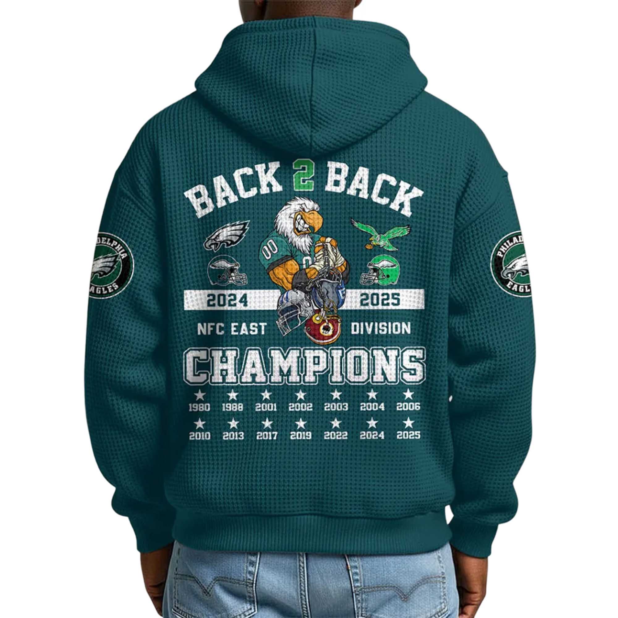The Eagles NFC East Division Champions 2025 Quarter Zip Waffle Hoodie combines celebration and everyday wear in one versatile product. The front features a prominent Eagles logo and the word “Champion,” while the back boasts a bold design inspired by the “Back-to-Back” slogan, celebrating the 2024 and 2025 regional championship victories. The ¼ zip-up collar offers versatility for changing weather, ideal for match days, travel, or casual outings.