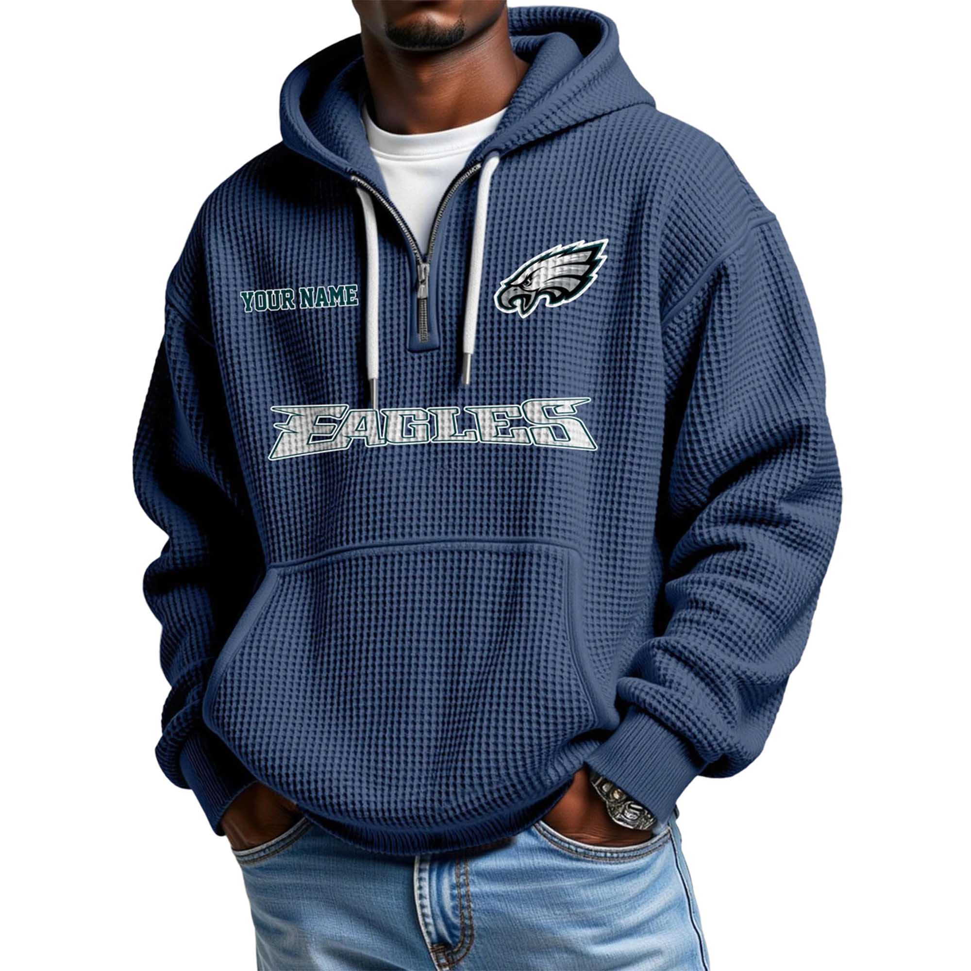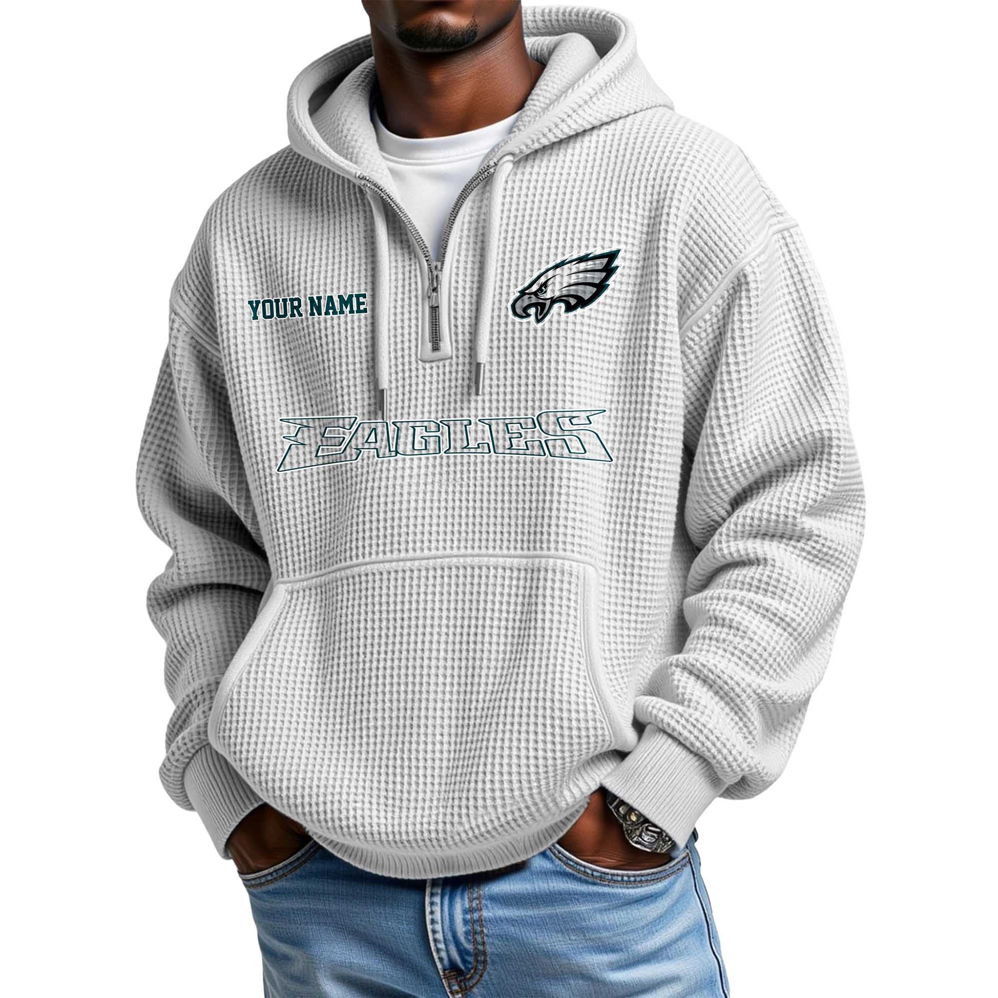 The Eagles Personalized Quarter Zip Waffle Hoodie is designed for fans who want to express their love for Eagles in a personal way. With the bold “EAGLES” lettering, the signature eagle logo, and the customizable name area, this hoodie stands out for both individuality and modernity. Its sporty, streamlined design makes it suitable for casual wear, competition day, and everyday street style.
