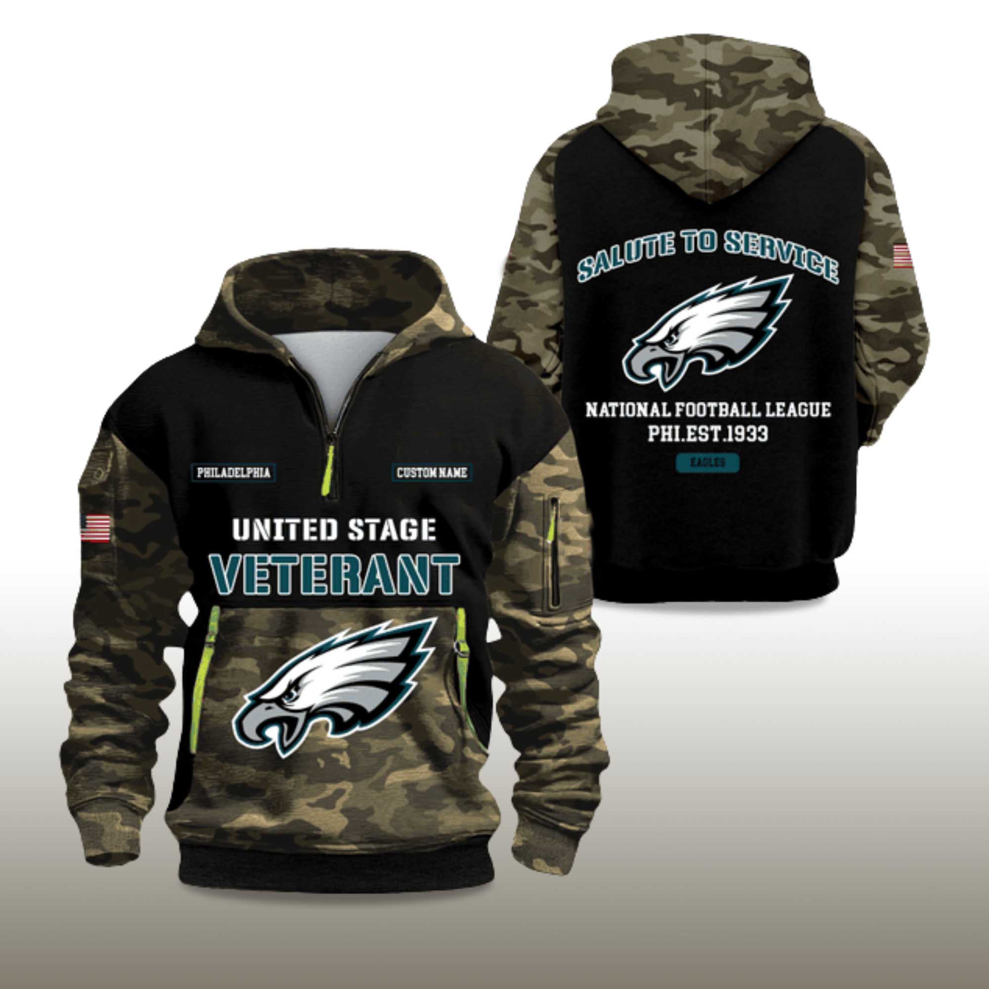 This hoodie features a rugged camouflage base, balanced with bold black accents and accented with iconic team green. The front reads “UNITED STAGE VETERANT” and the Eagles logo, while the back reads “SALUTE TO SERVICE” above a detailed team graphic. A quarter-zip collar adds versatility, allowing you to easily adjust to changing weather conditions.