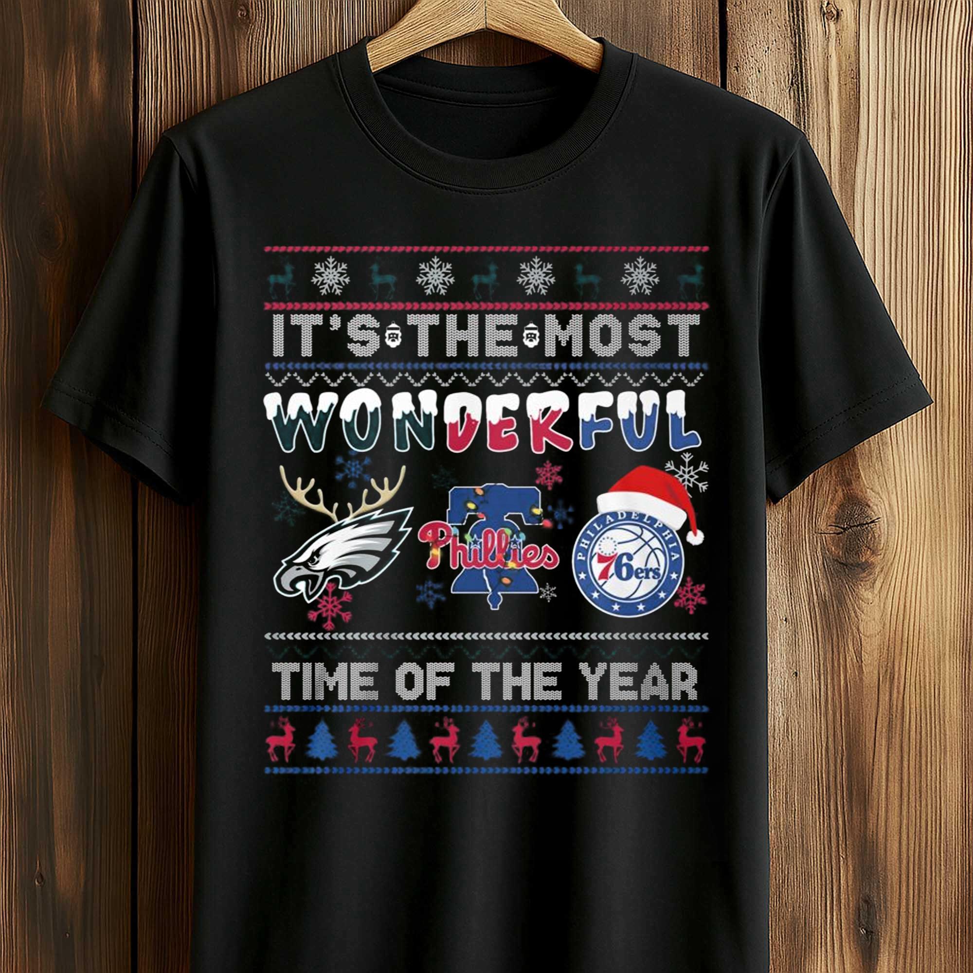Eagles x Phillies x 76ers It’s The Most Wonderful Time Of The Year T-Shirt – Philly Pride in Holiday Style
