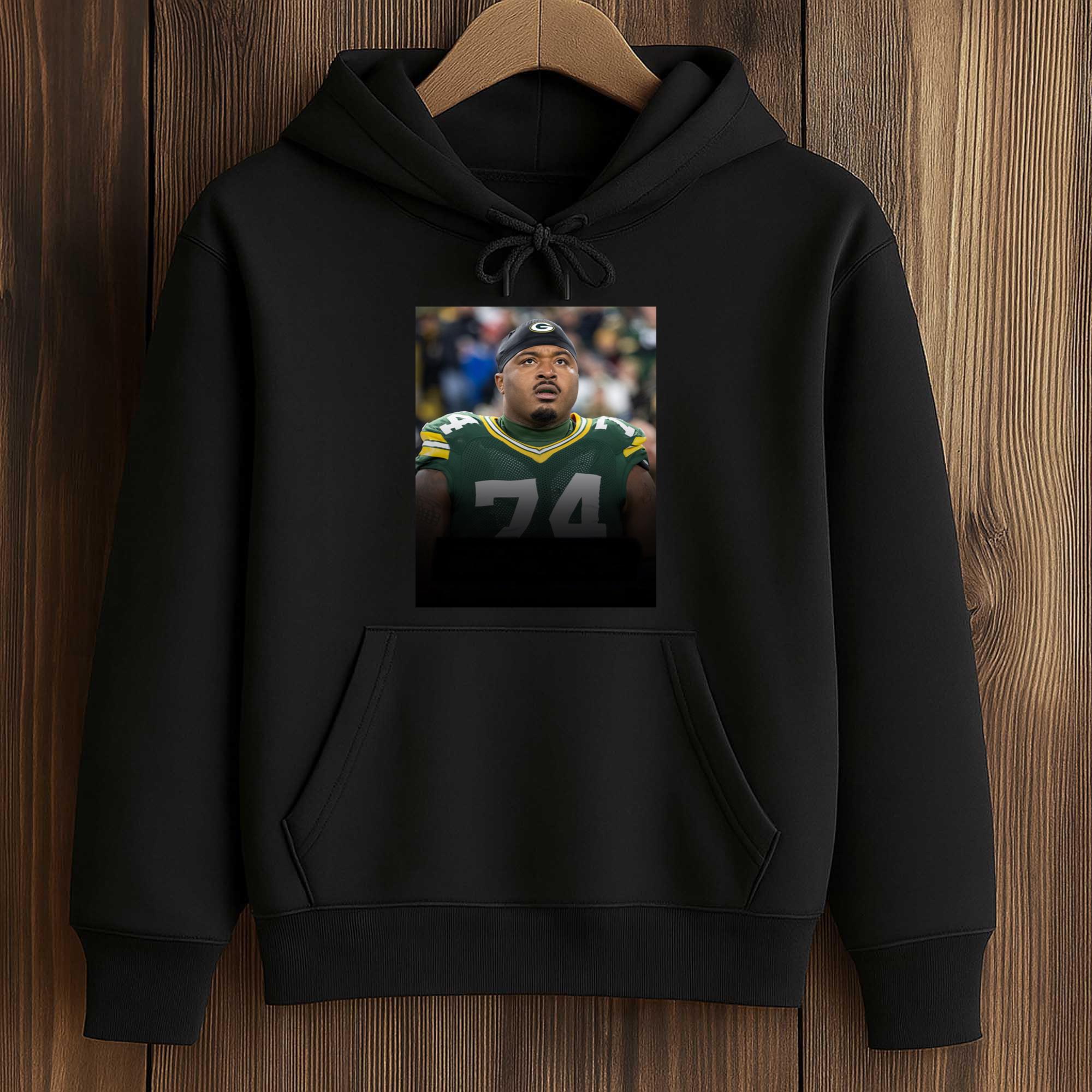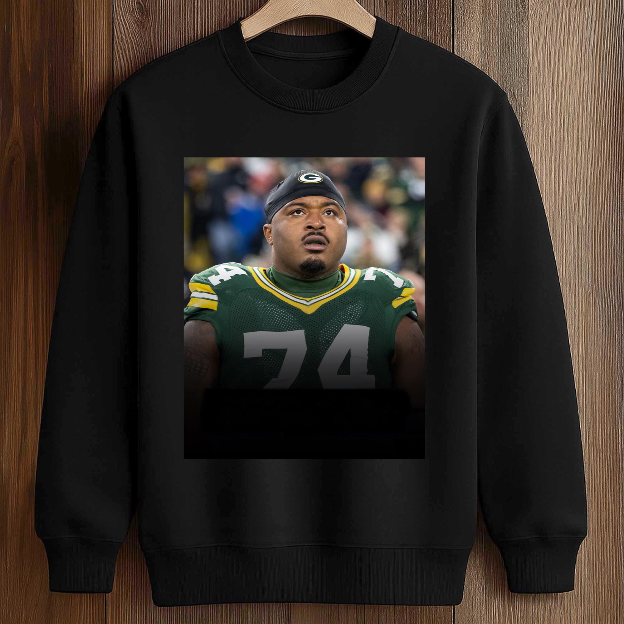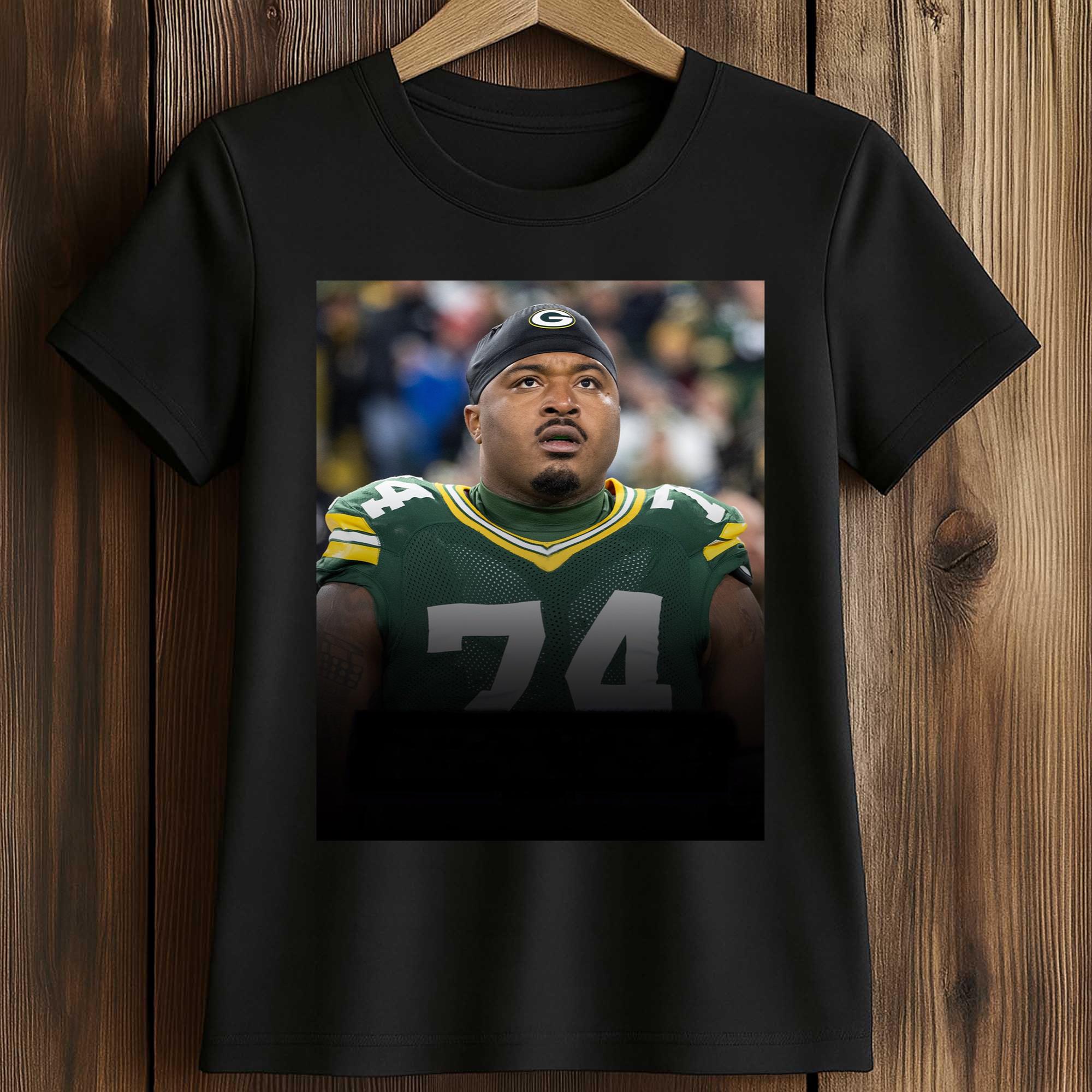 The shirt’s design focuses on the impressive portrait of the player, instantly drawing attention. The realistic image highlights Jenkins in the Packers’ iconic green and gold uniform, creating a strong connection to the team’s identity. The dark background helps the image stand out, while the balanced composition makes the shirt stylish and easy to wear. It’s a powerful visual product that expresses pride in both the player and the team.