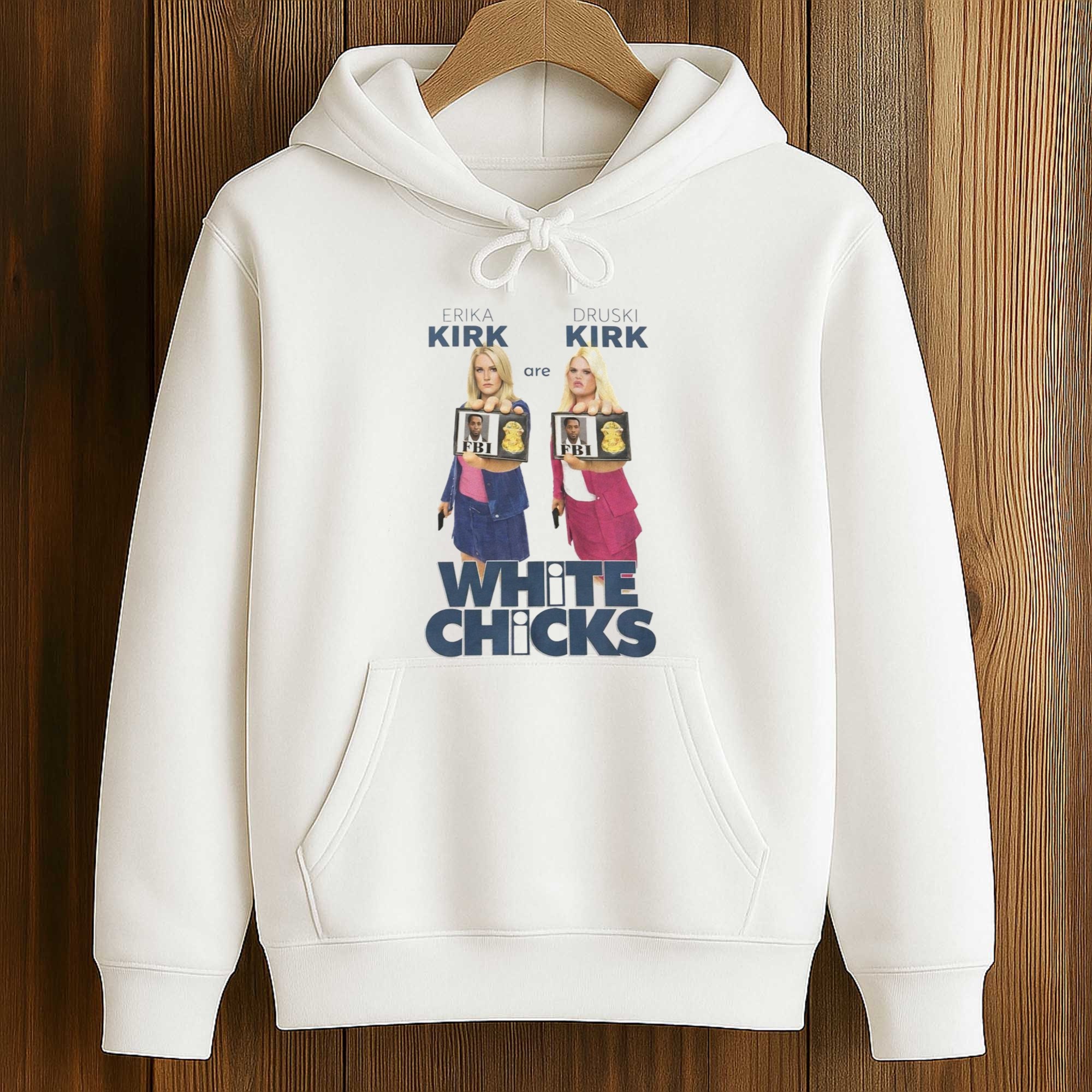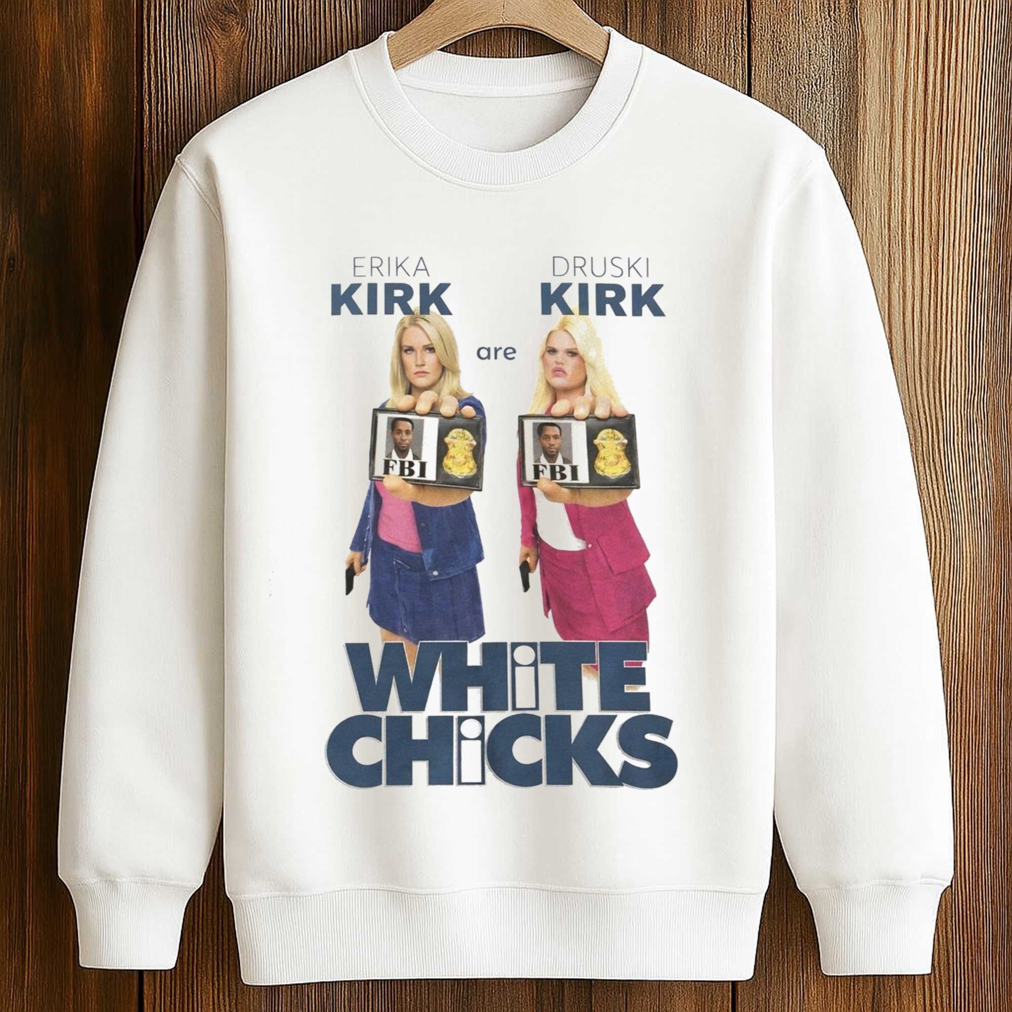 The Erika Kirk Are Druski Kirk White Chicks Shirt features a striking graphic layout with images of the two characters, bold names, and fun FBI-style details, adding humor to the design. The prominent print stands out clearly against a light background, making all elements easily noticeable. This shirt is soft and comfortable for everyday wear, with a loose fit suitable for casual outings or a relaxed style.
