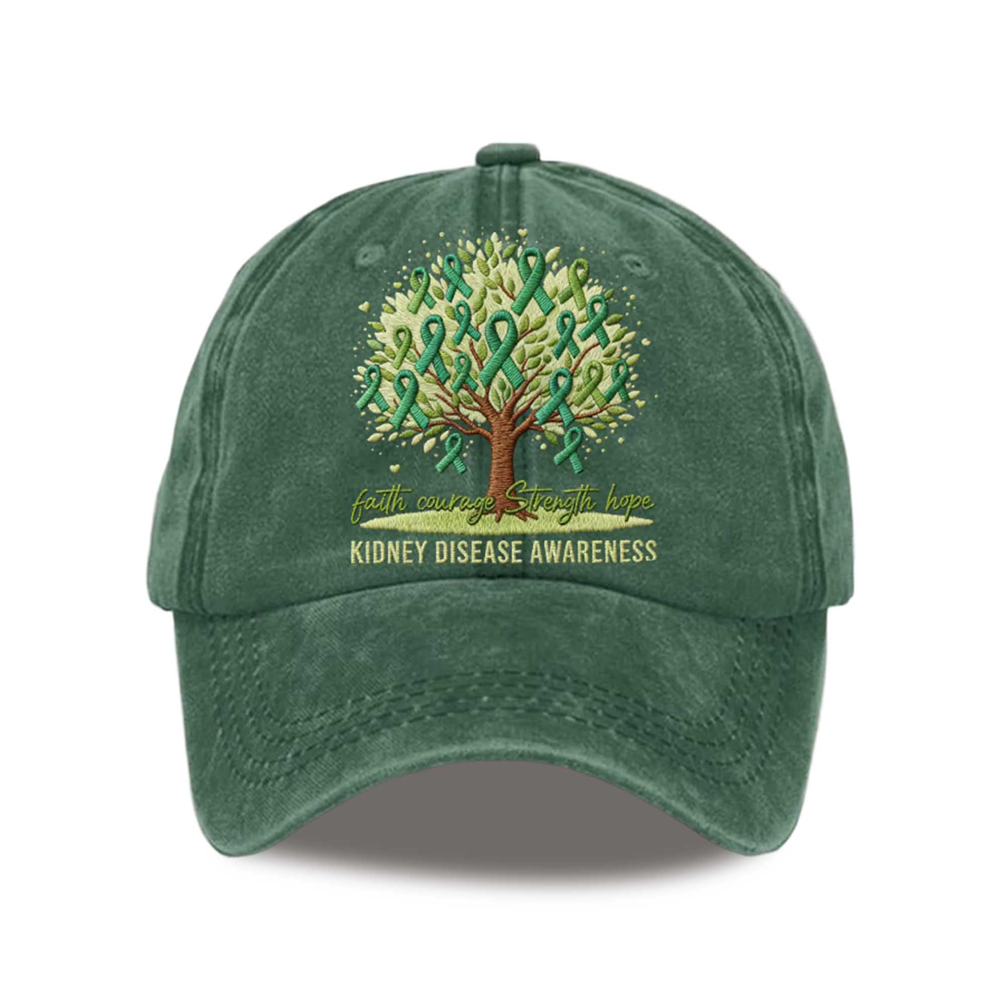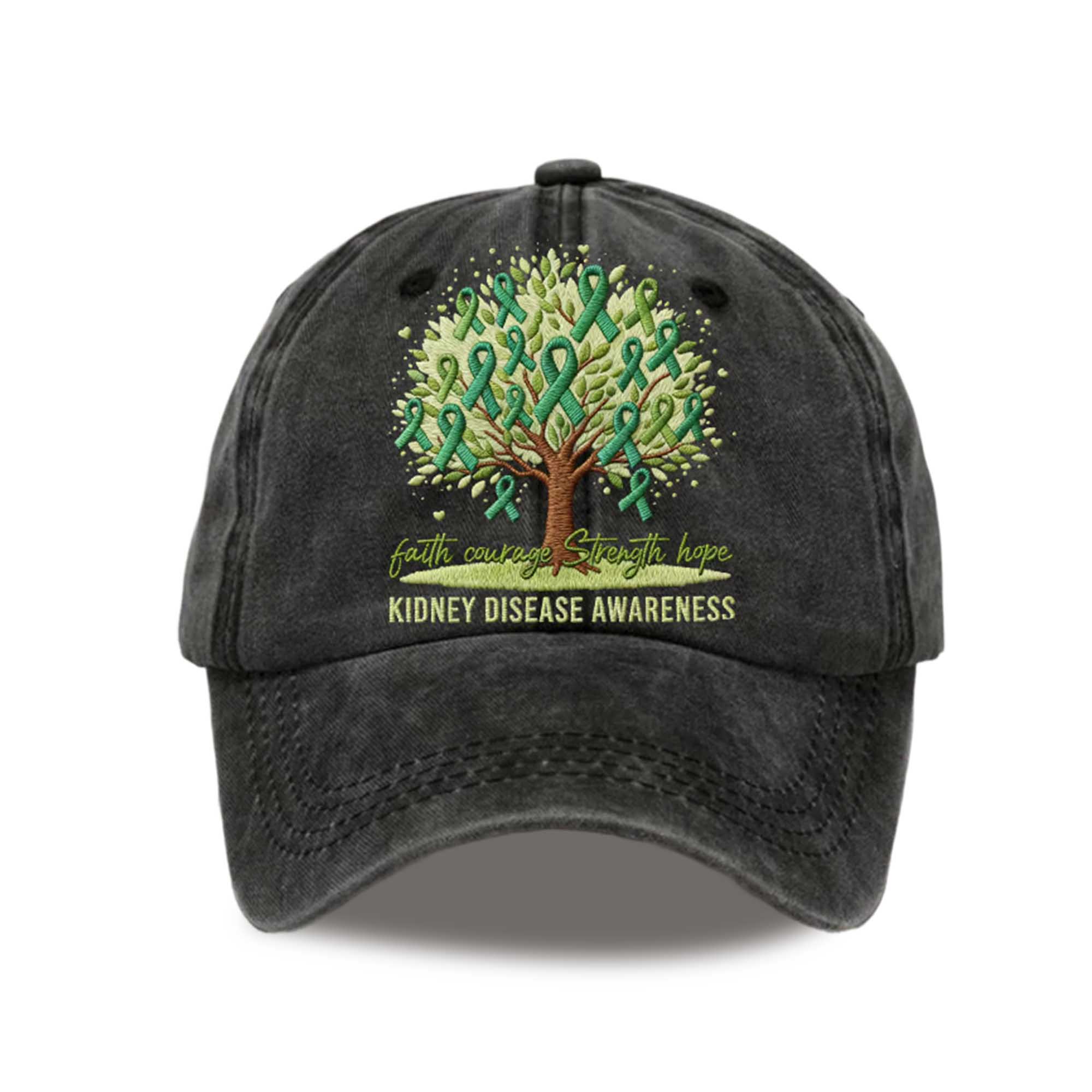 The hat stands out with its meticulously embroidered and symbolic motif. The tree design, created from green ribbons, symbolizes growth, healing, and unity within the kidney disease awareness movement. The classic dark hat color highlights the green and yellow tones, creating a strong visual contrast. The curved brim provides practical comfort while maintaining a simple, stylish look suitable for everyday wear.
