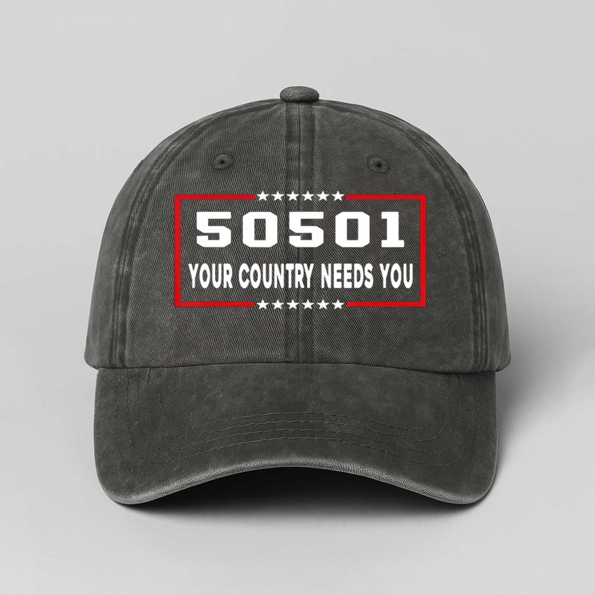 The FDT 50501 Your Country Needs You America Hat makes a strong patriotic statement with its distinctive design. The distressed black hat features a red-bordered rectangular patch with the words “50501” prominently displayed above the rallying message “YOUR COUNTRY NEEDS YOU,” all emblazoned with five white stars along the bottom. This thoughtfully designed hat combines American pride with everyday wearability, appealing to those who value civic engagement.