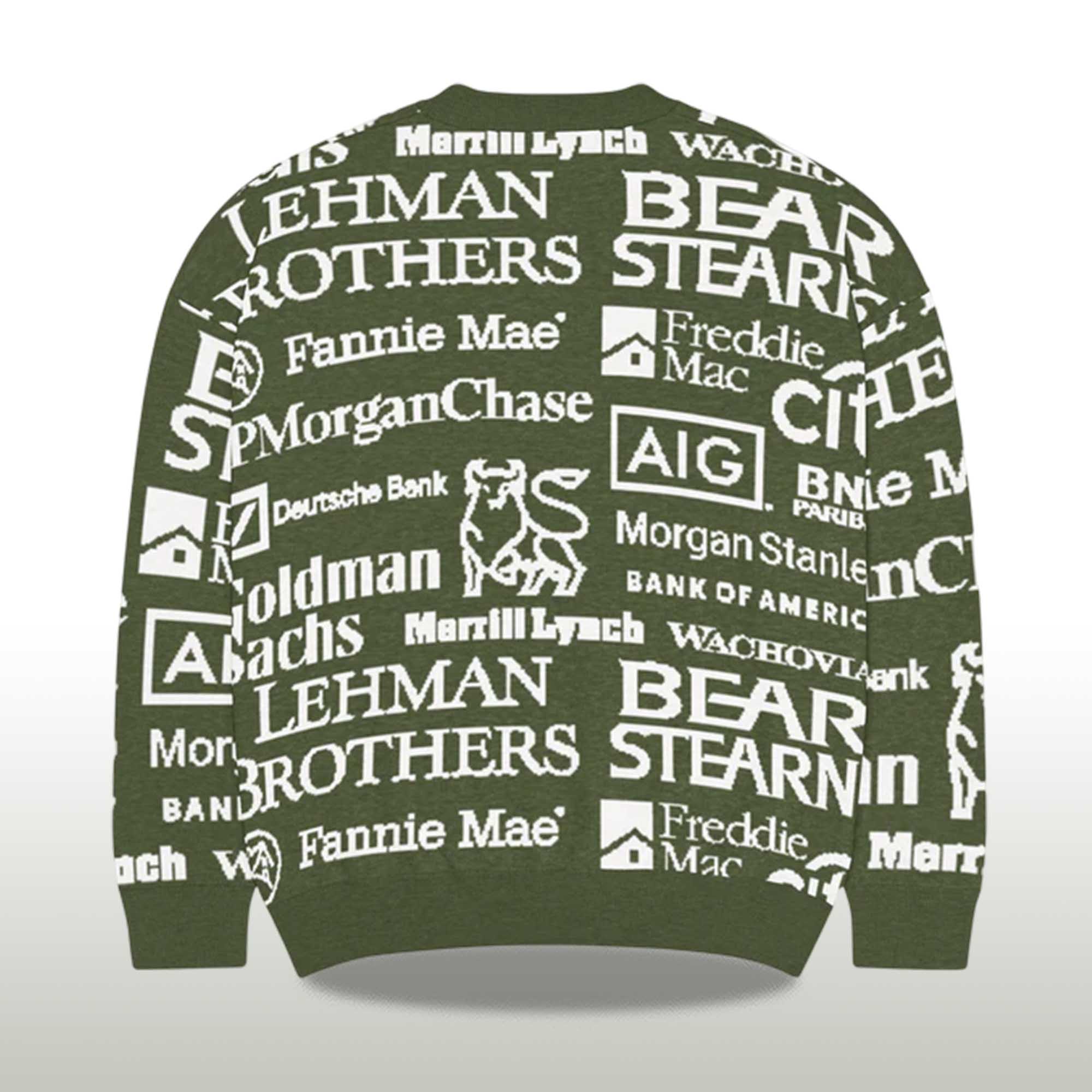 The sweater features iconic financial institutions all over the body creating a chaotic collage that perfectly reflects the economic madness of the time. The dark green base adds a classic, calming tone, while the bold white typography stands out for maximum visual impact. Made from a soft, cozy blend, the sweater is comfortable enough for winter gatherings and stylish enough to turn heads at any ugly sweater party. Whether you’re knowledgeable about the 2008 crisis or simply love satirical fashion, this design seamlessly connects humor and history.