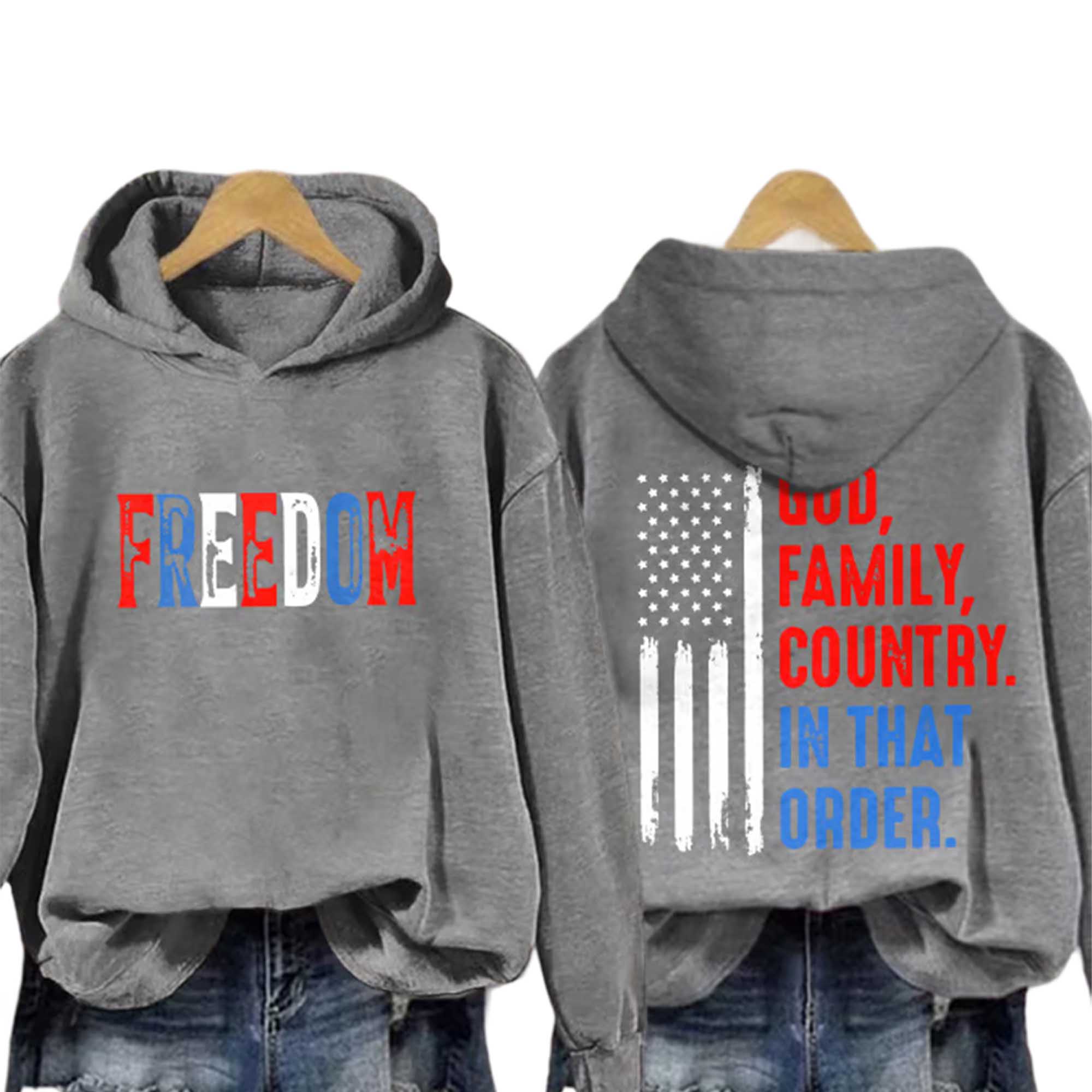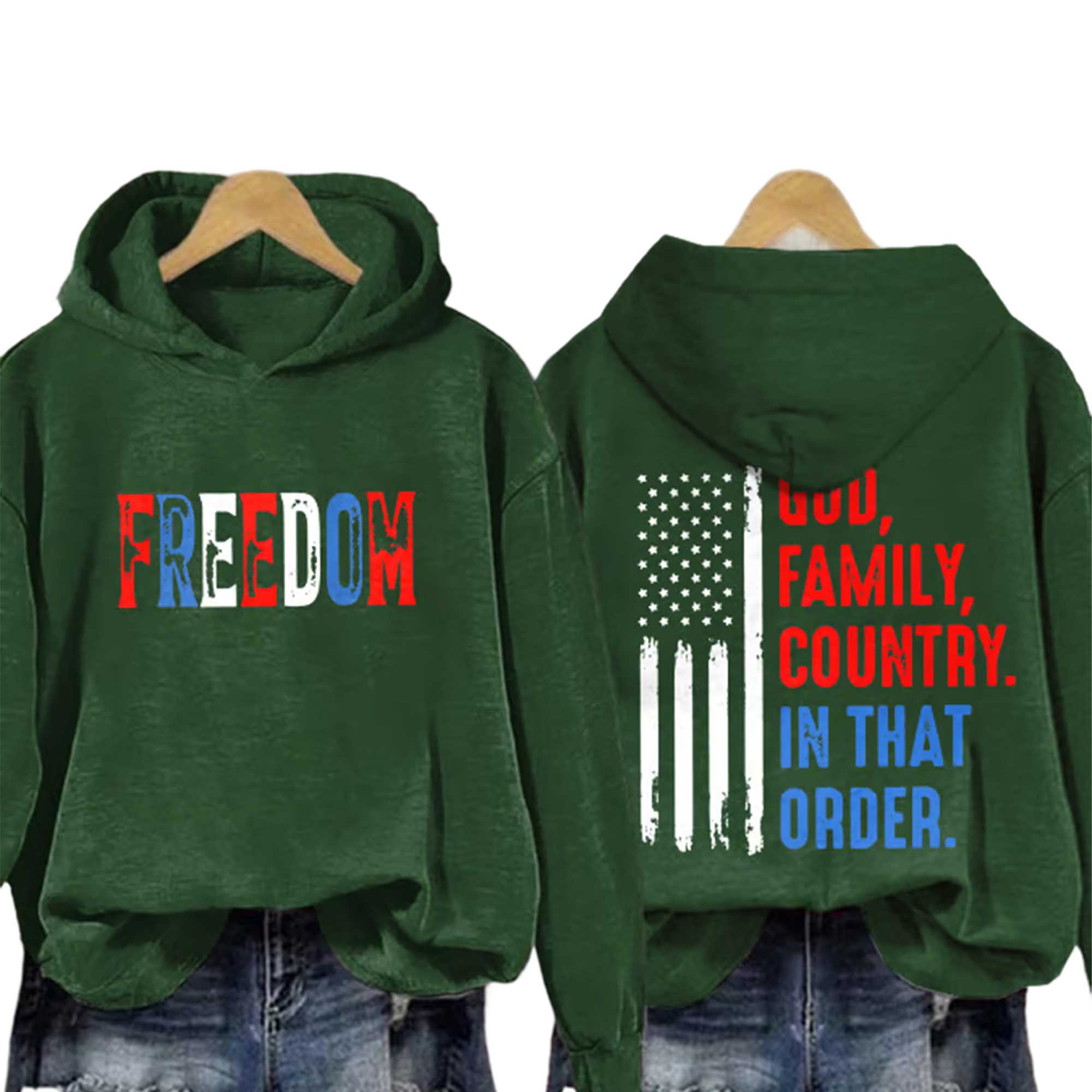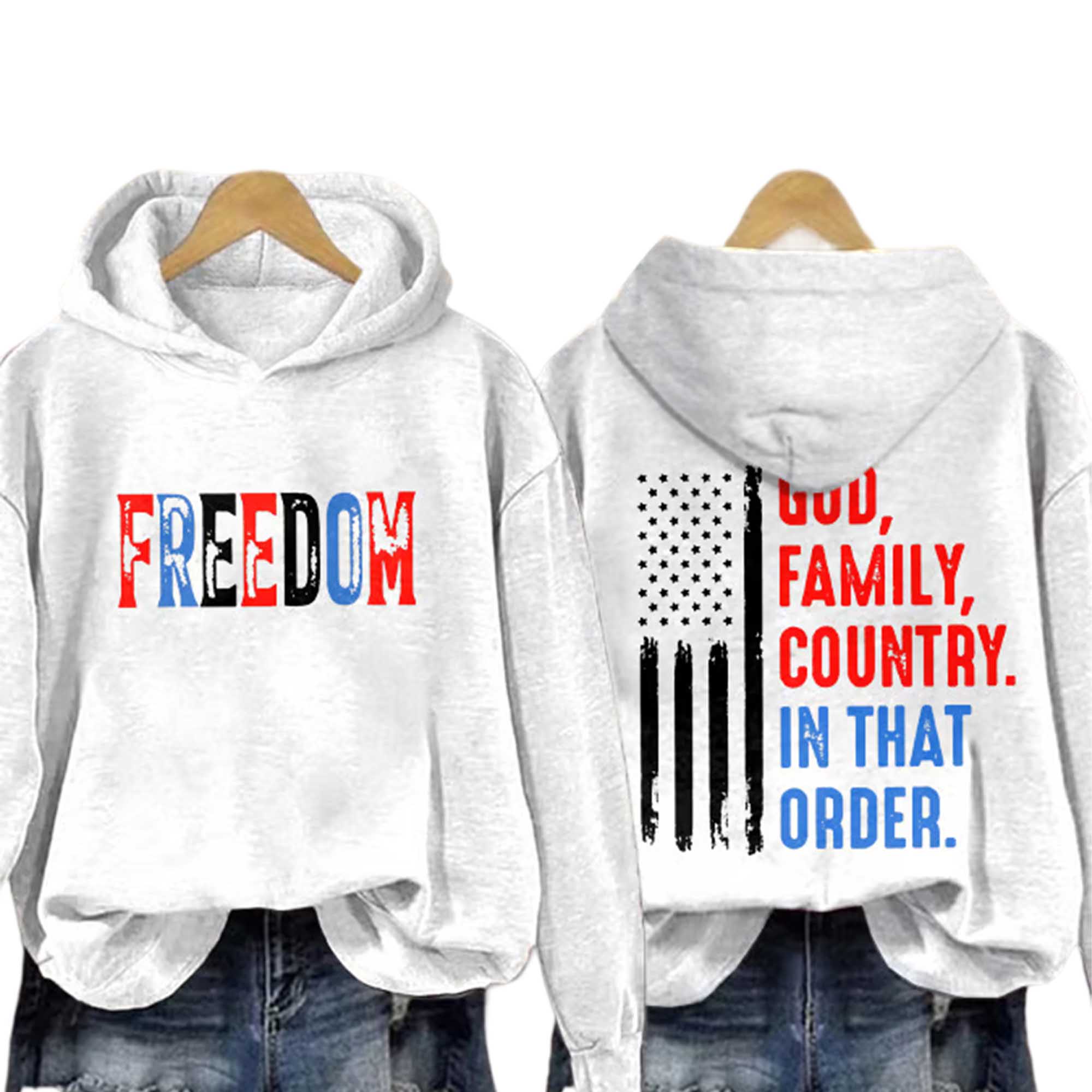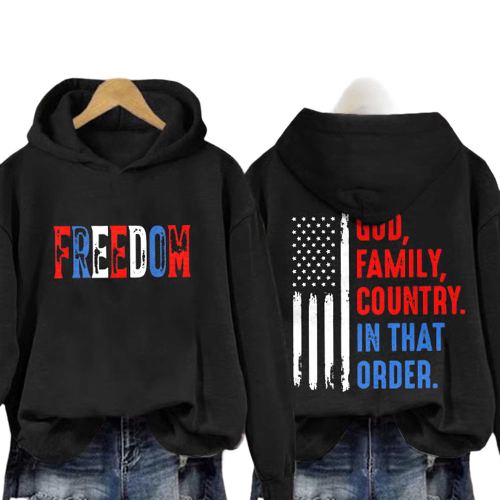 The Freedom God, Family, Country In That Order Hoodie combines powerful images and messages that many people can relate to. Featuring red, white, and blue “FREEDOM” on the front, and a bold statement on the back, the hoodie reflects a way of life built on faith, loyalty, and patriotism. It’s a style that feels relatable at first sight.