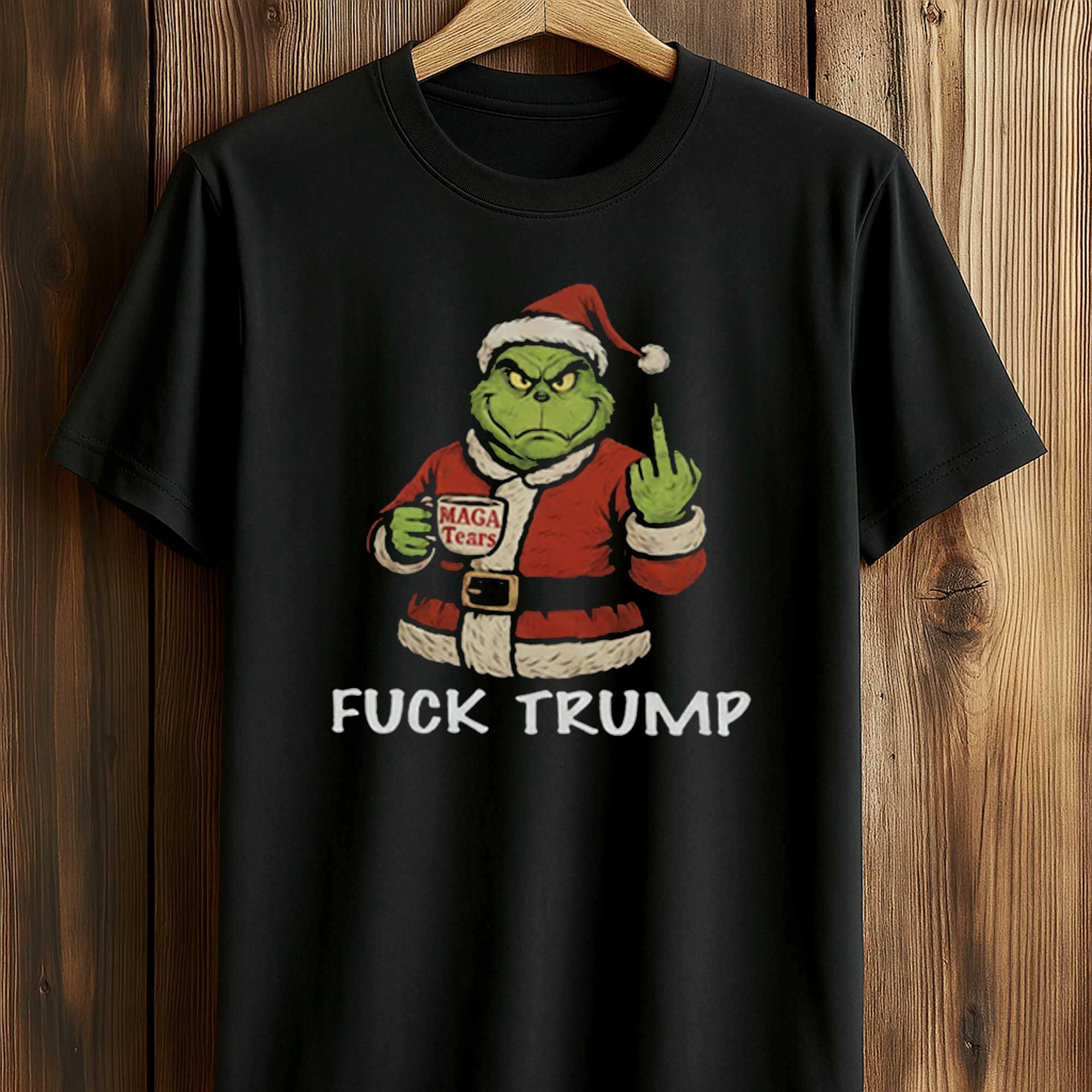 The design focuses on a Grnch style character in Christmas attire, holding a cup and making a rude gesture, combined with bold lettering below. The contrast between the playful festive imagery and the blunt political humor creates an immediate visual impact. The design is clean, balanced, and intentionally provocative, giving the shirt a strong personality without being overwhelming.
